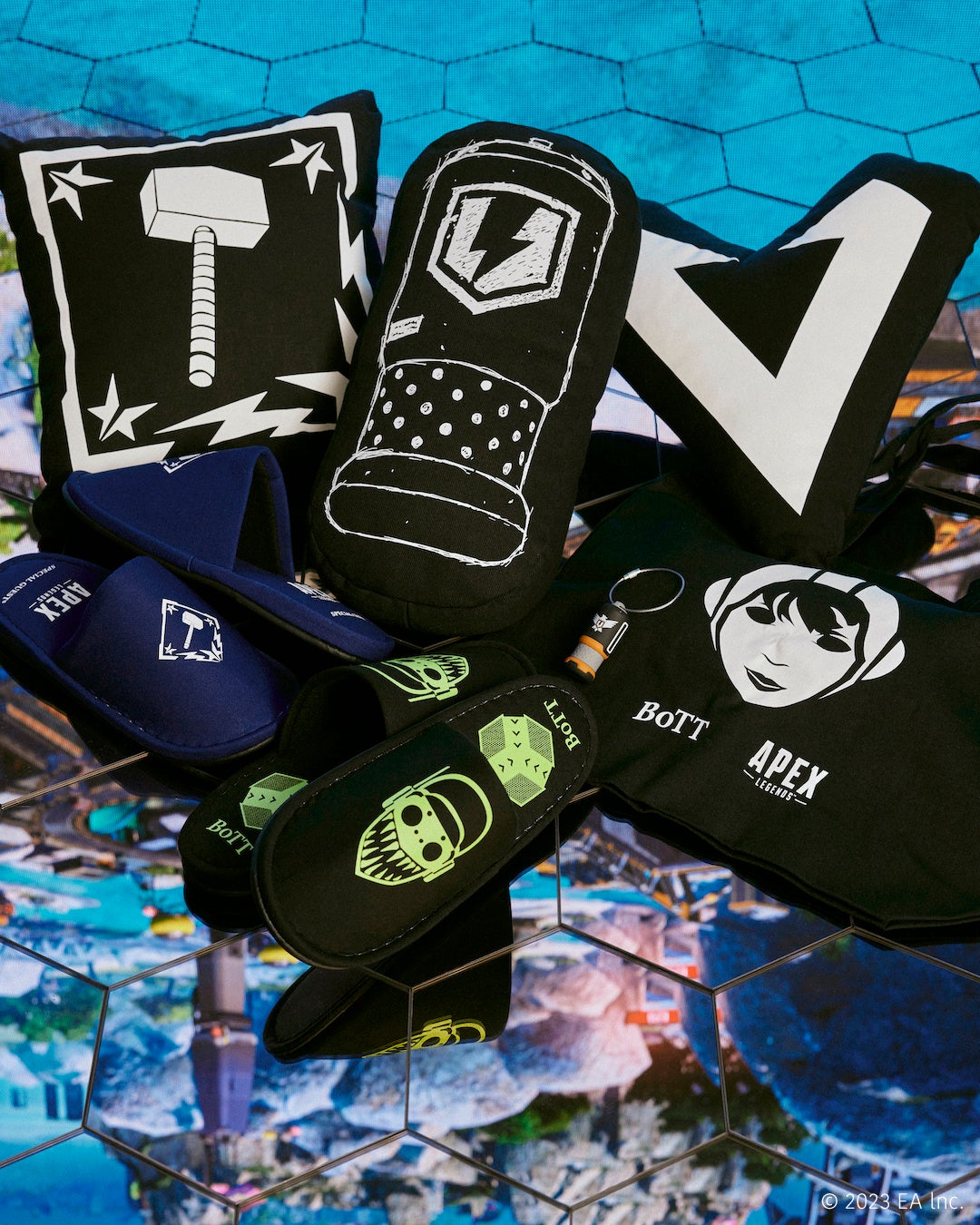 『APEX LEGENDS™』をプレイする際のユニフォームとしてはもちろん、デイリーユースにも対応する今回のコラボレーションは、クッションやルームシューズなど、快適な『APEX LEGENDS™』ライフをサポートするホームウェアも登場。