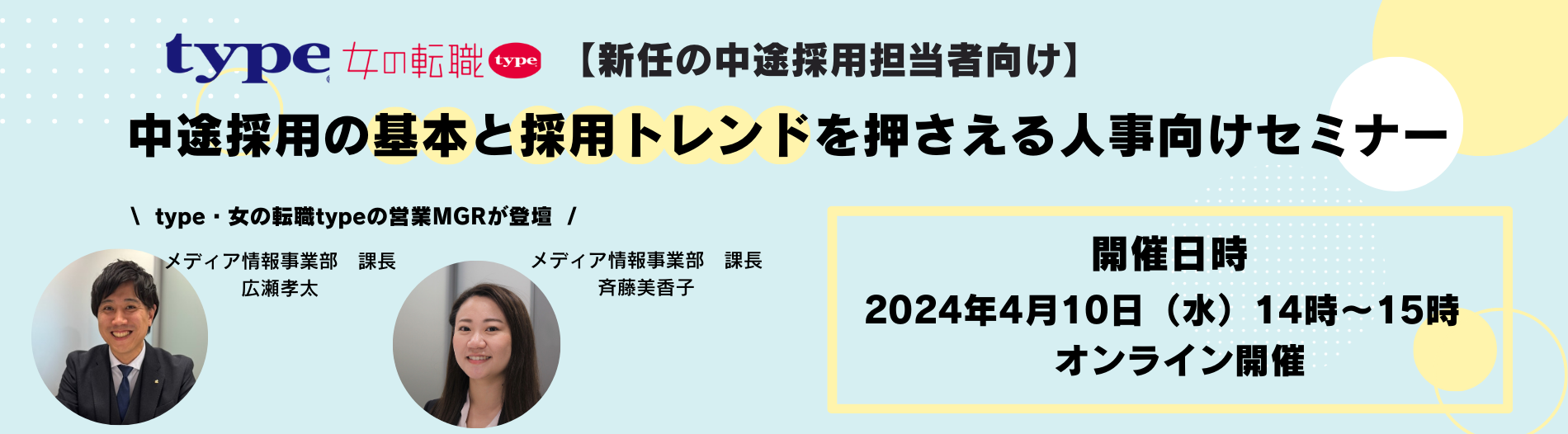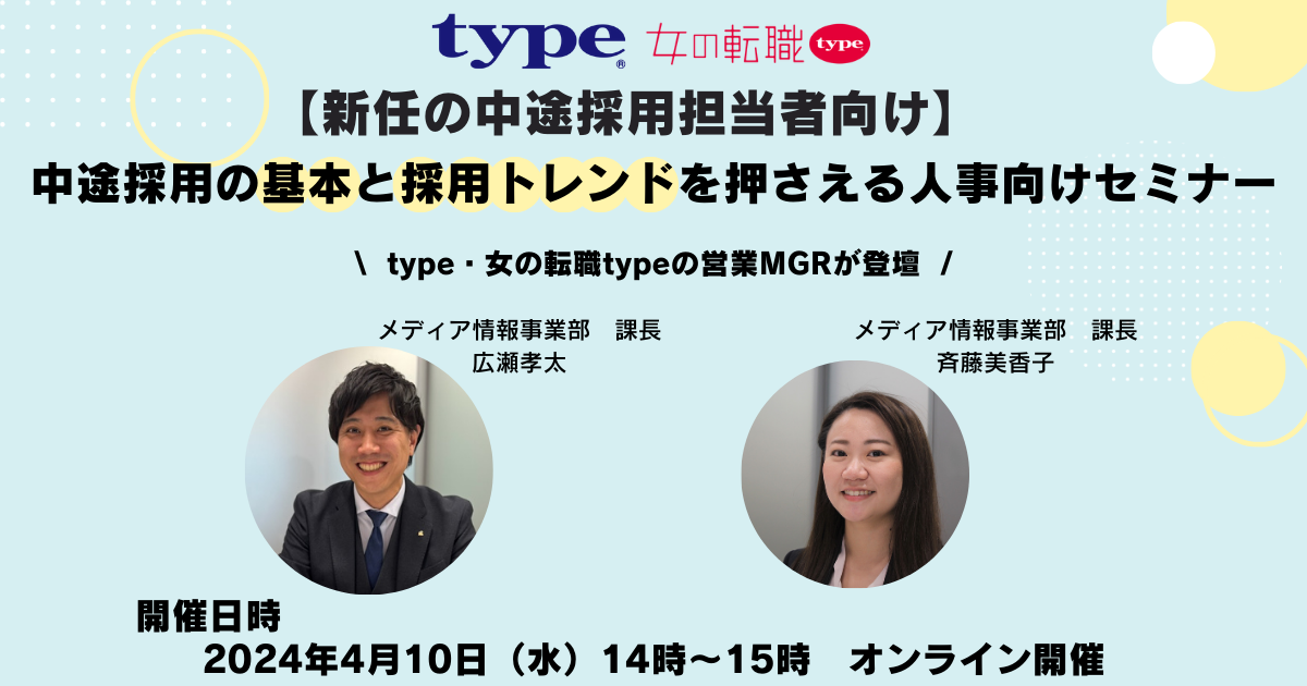 転職サイト「type/女の転職type」では、4/10(水)14時より「【新任の中途採用担当者向け】中途採用の基本と採用トレンドを押さえる人事セミナー」を開催いたします。