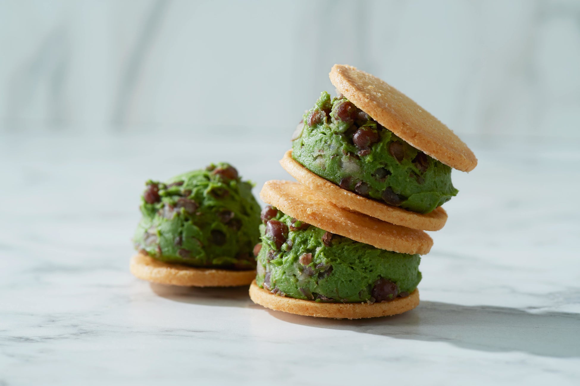 埼玉県の狭山茶チーズクリームに北海道産大納言かのこ豆を入れ、チーズクッキーでサンドしました。