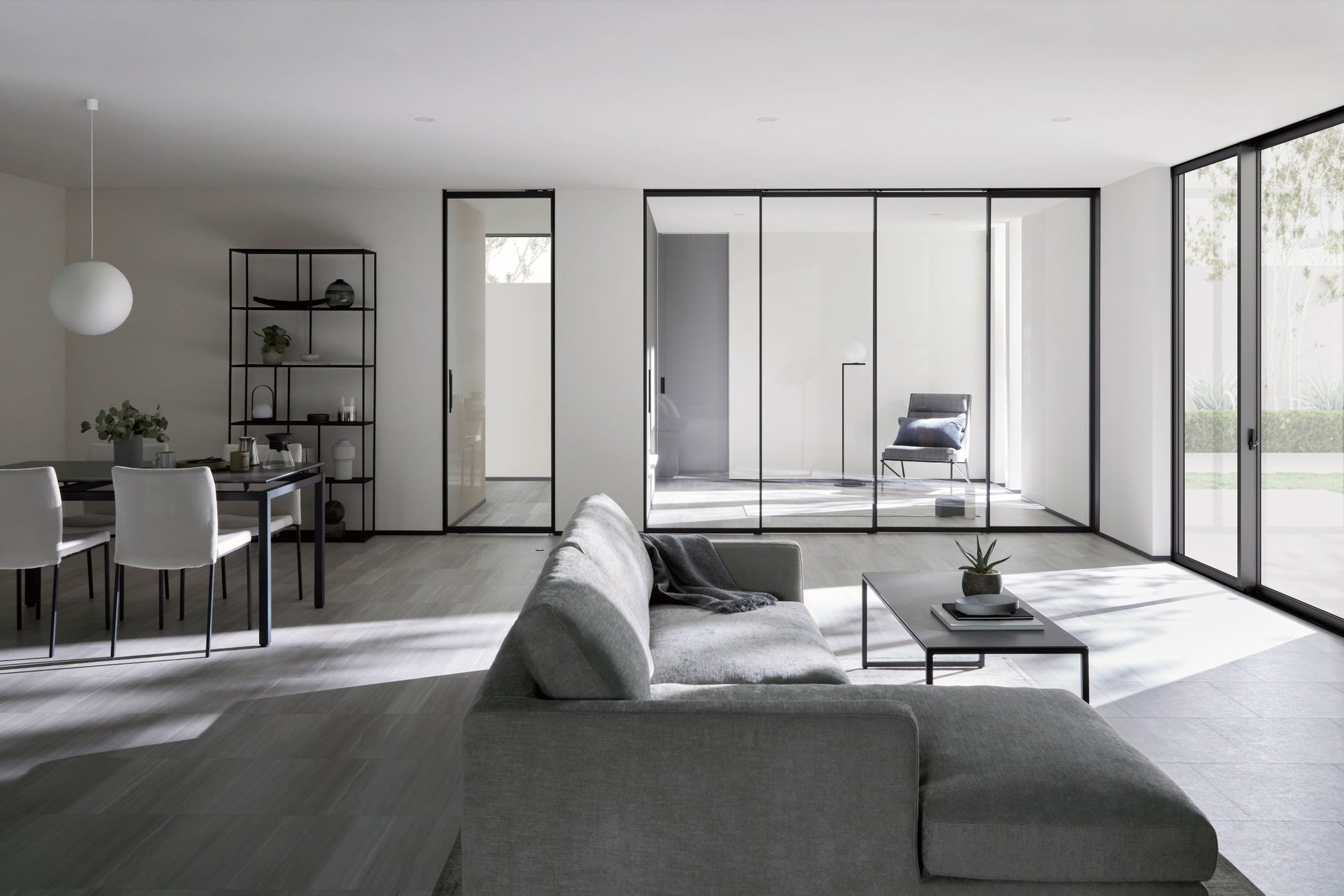 天井まで高さを出した空間づくりの新たな選択肢として開発した高さ2.7m 、見付15mmのスリムなアルミ製ガラスドアと引戸です。マットな質感のスリムなフレームと、意匠を合わせたハンドルでノイズを抑え、仕切りながらも開放感をもたらす上質な空間をご提供します。