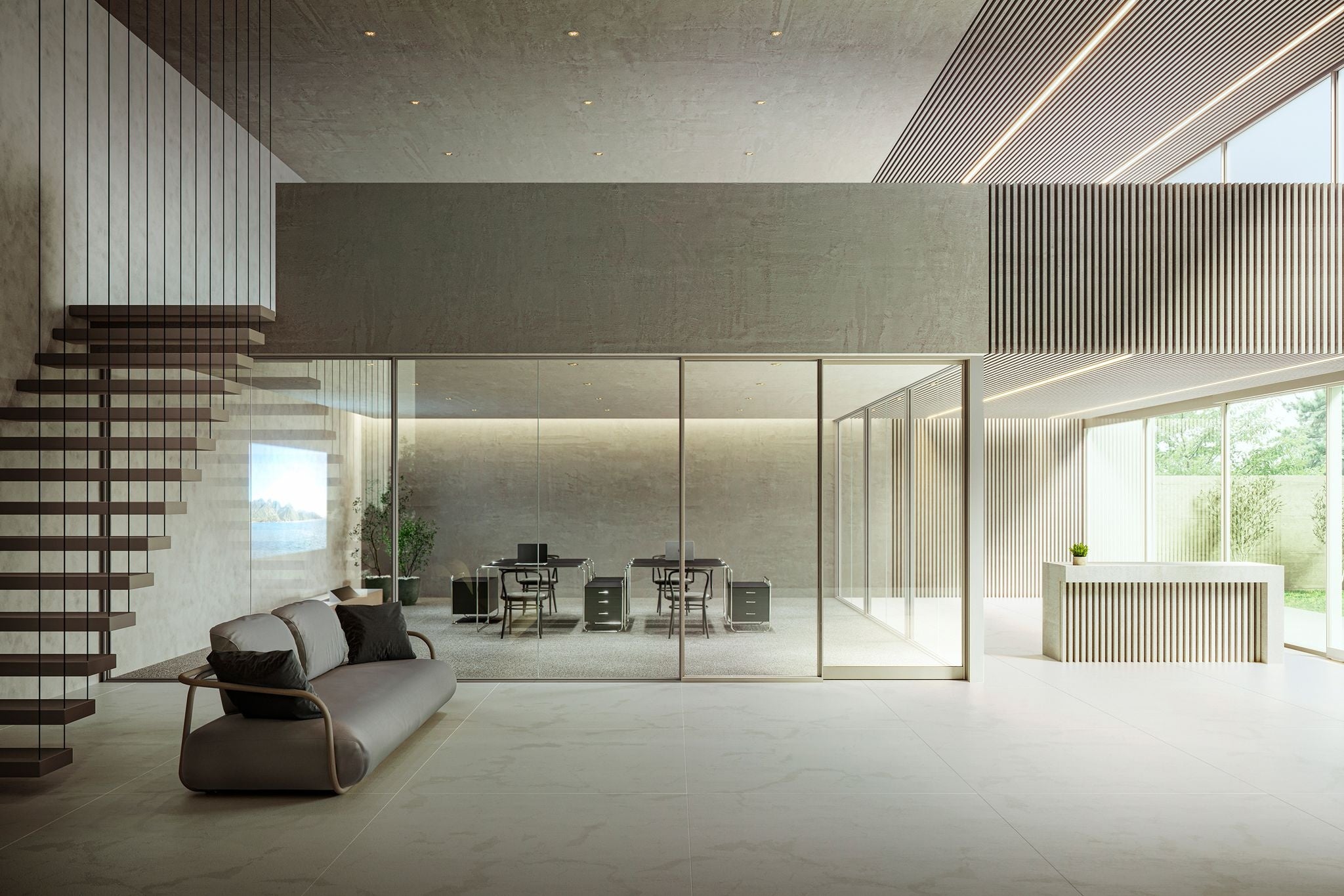 日本独自の繊細な美意識に根差した精緻を極めたデザインのインテリアスライディングドア「GLASS R」は、日本製では最大の幅約13m、高さ3mの大開口で、フレーム幅12mm、床にレールはなく、天井面は極限まで細くしたレール溝のみが通るなど、ディテールまでこだわり抜き圧倒的な洗練を体現。開放的な空間の中に凛とした雰囲気を創り出します。