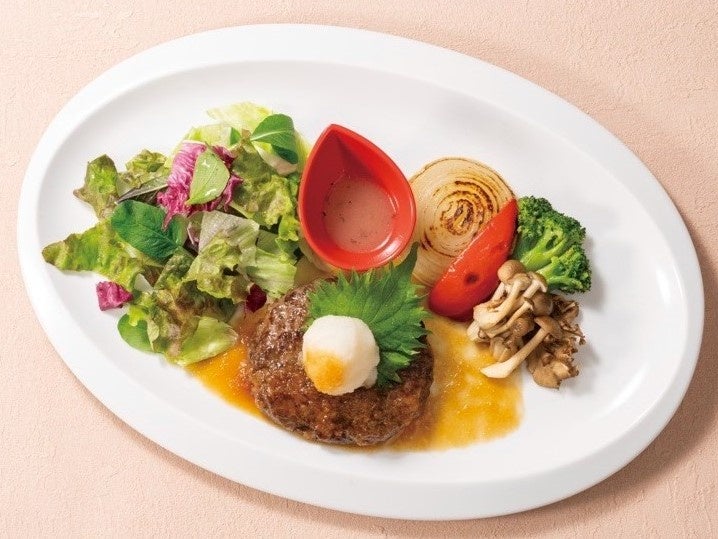 牛肉の旨みを最大限に引き出すため厳選した部位を使用し、つなぎを極力抑えた牛肉100%のハンバーグ。トッピングの大葉おろしと、すりおろし玉ねぎを加えたさっぱり特製和風ソースが相性抜群です。
