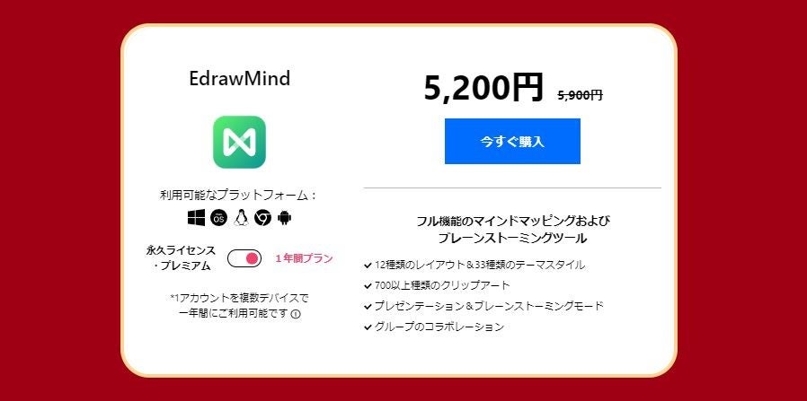 こちらは同じエドラ製品でも「マインドマップ」に特化した製品【EdrawMind(エドラマインド)】です。