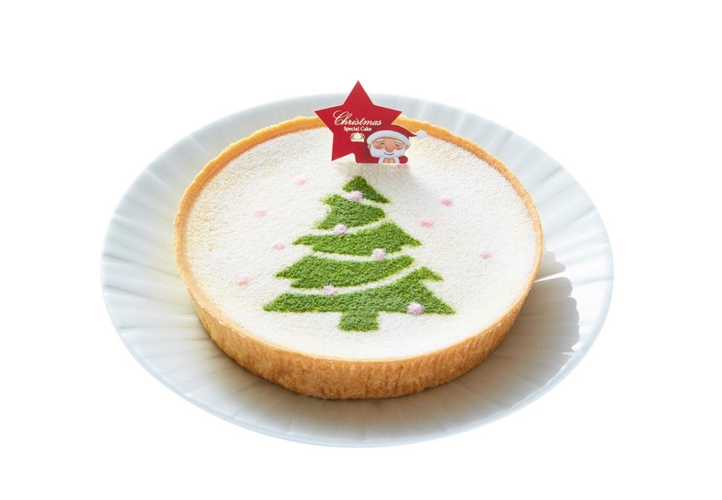 北海道根釧地区で採れた生乳を使用したなめらかな食感とミルキーな風味のマスカルポーネチーズケーキに、抹茶パウダーとストロベリーパウダーで可愛らしいクリスマスツリーを描きました。