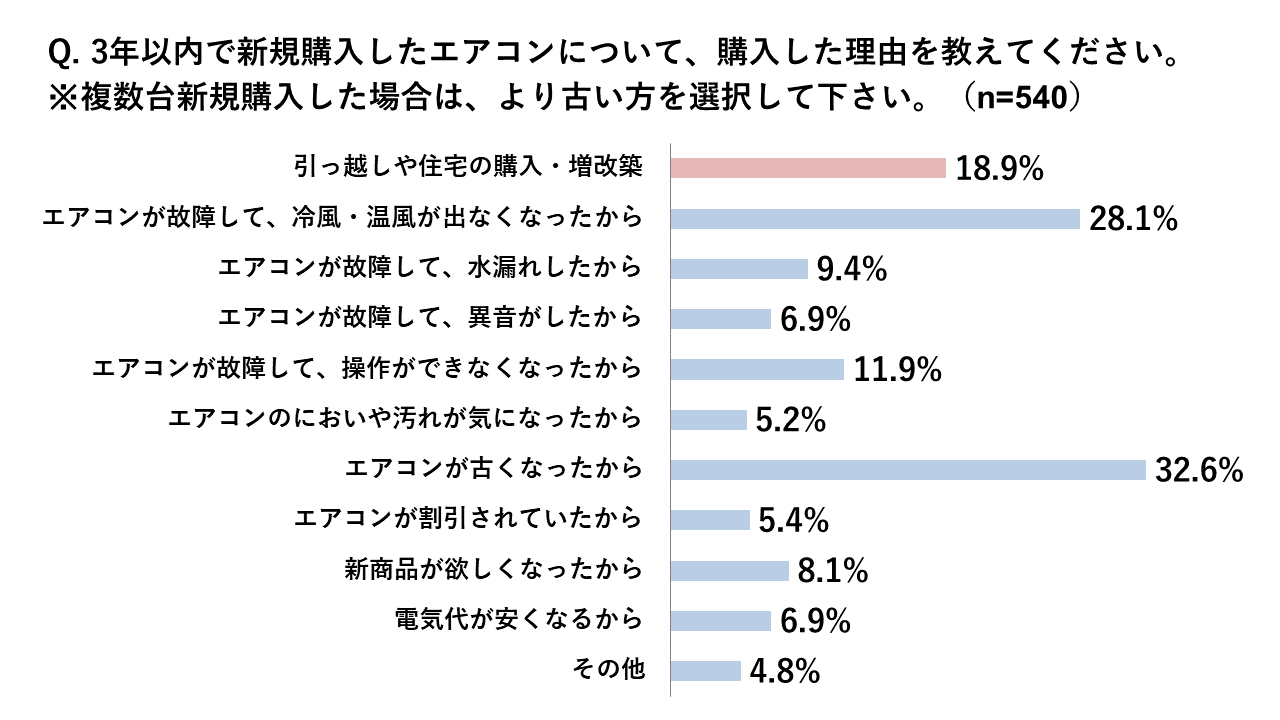 「3年以内で新規購入したエアコンについて、購入した理由を教えてください。」という質問では、「引っ越しや住宅の購入・増改築」が約19%に。実に、エアコンを購入する人の約5人に1人は、引っ越しや住宅の購入・増改築を理由に購入していることがわかりました。