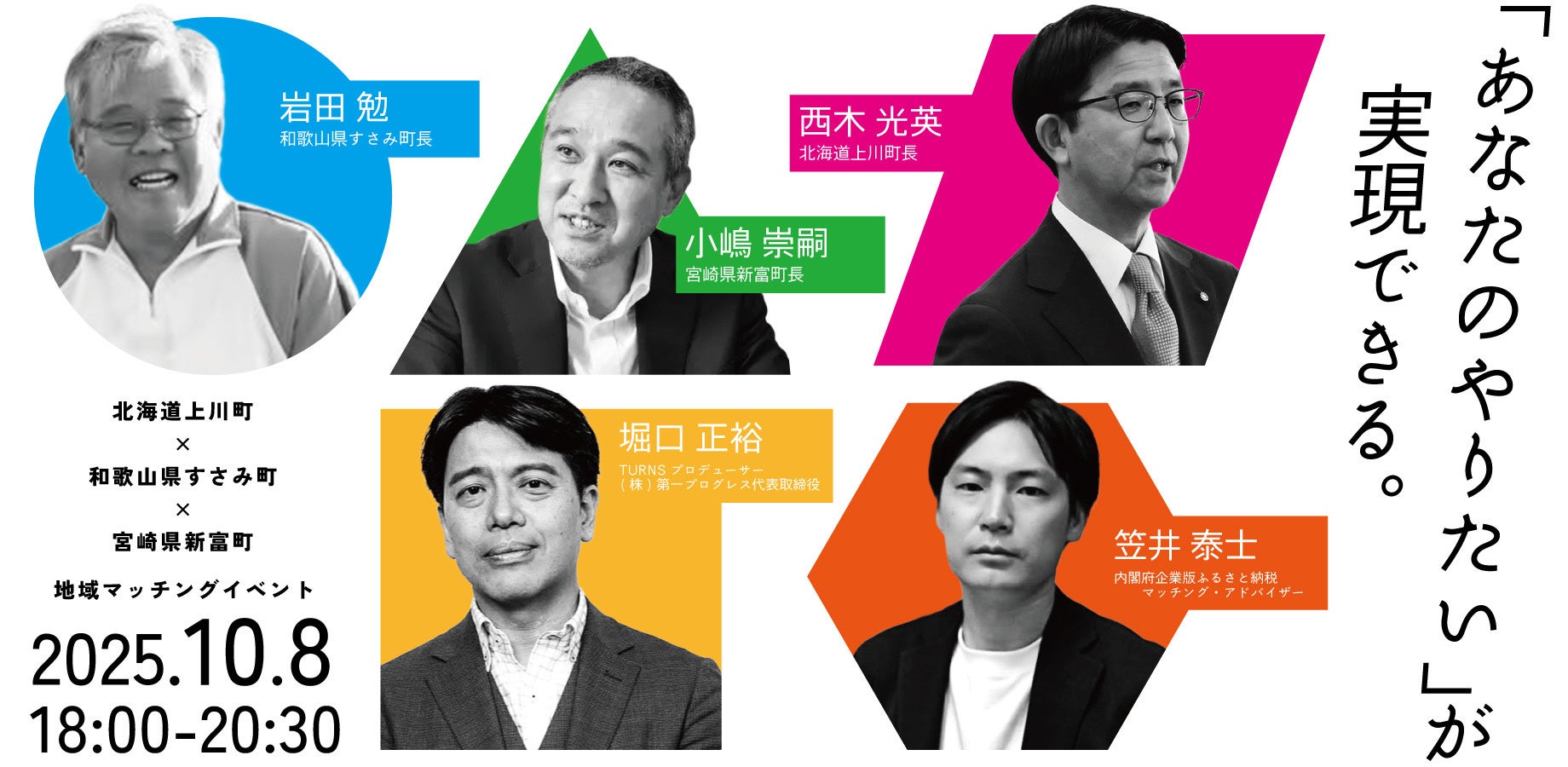 【10/8開催】3町長が東京に集結!地域の未来を語る「まちづくりマッチングイベント」開催 ~上川町(北海道)、すさみ町(和歌山)、新富町(宮崎)が二拠点居住や地域活性の魅力を発信~