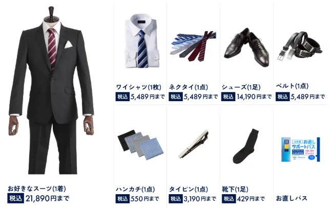 お好きなデザインのスーツ(1着)、ワイシャツ(1枚)、ネクタイ(1点)、シューズ(1足)、
