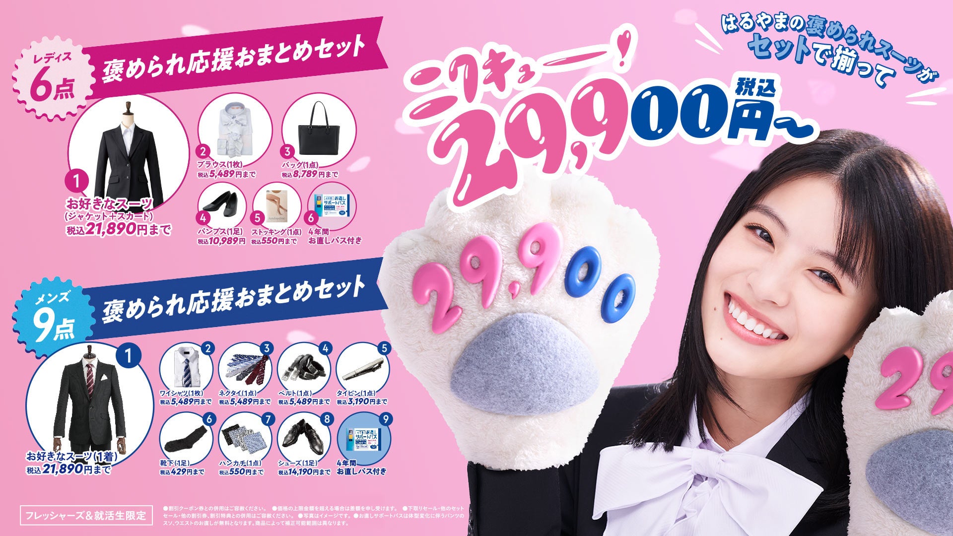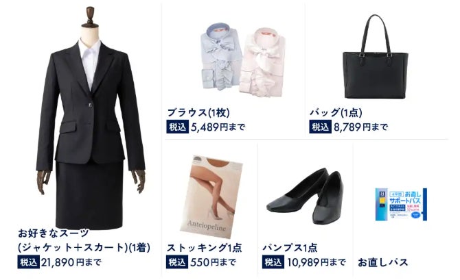 メンズスーツ・レディススーツ共に29,900円(税込)で、頭から足まで褒められ仕様の一式が揃うお得なセットです。さらに、今年のはるやまは、日々成長するフレッシャーズを全力でサポートするため、裾直しが4年間無償でできる「お直しサポートパス」も付いてきます。メンズ9点、レディス6点の「褒められセット」でファーストスーツを揃えましょう。