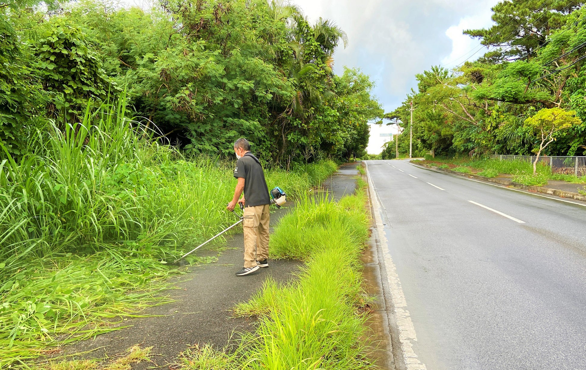 西表島ホテルがある西部エリアでは、道路上でのイリオモテヤマネコの目撃情報が多発しています。交通量が増えると、ロードキルが発生する可能性も高まるため、スタッフで月に一度、道路上の視認性を上げるために草刈り活動を実施しています。