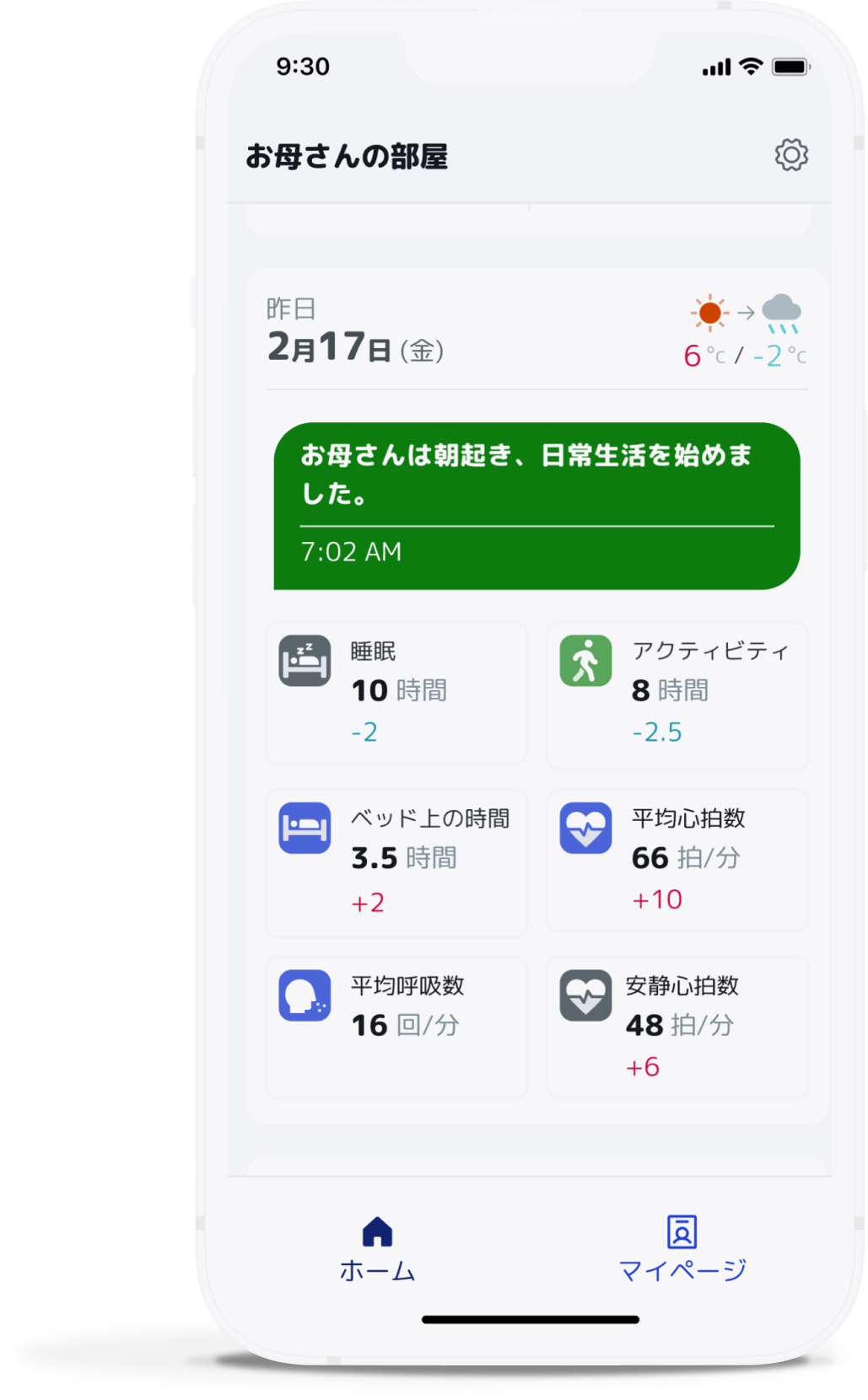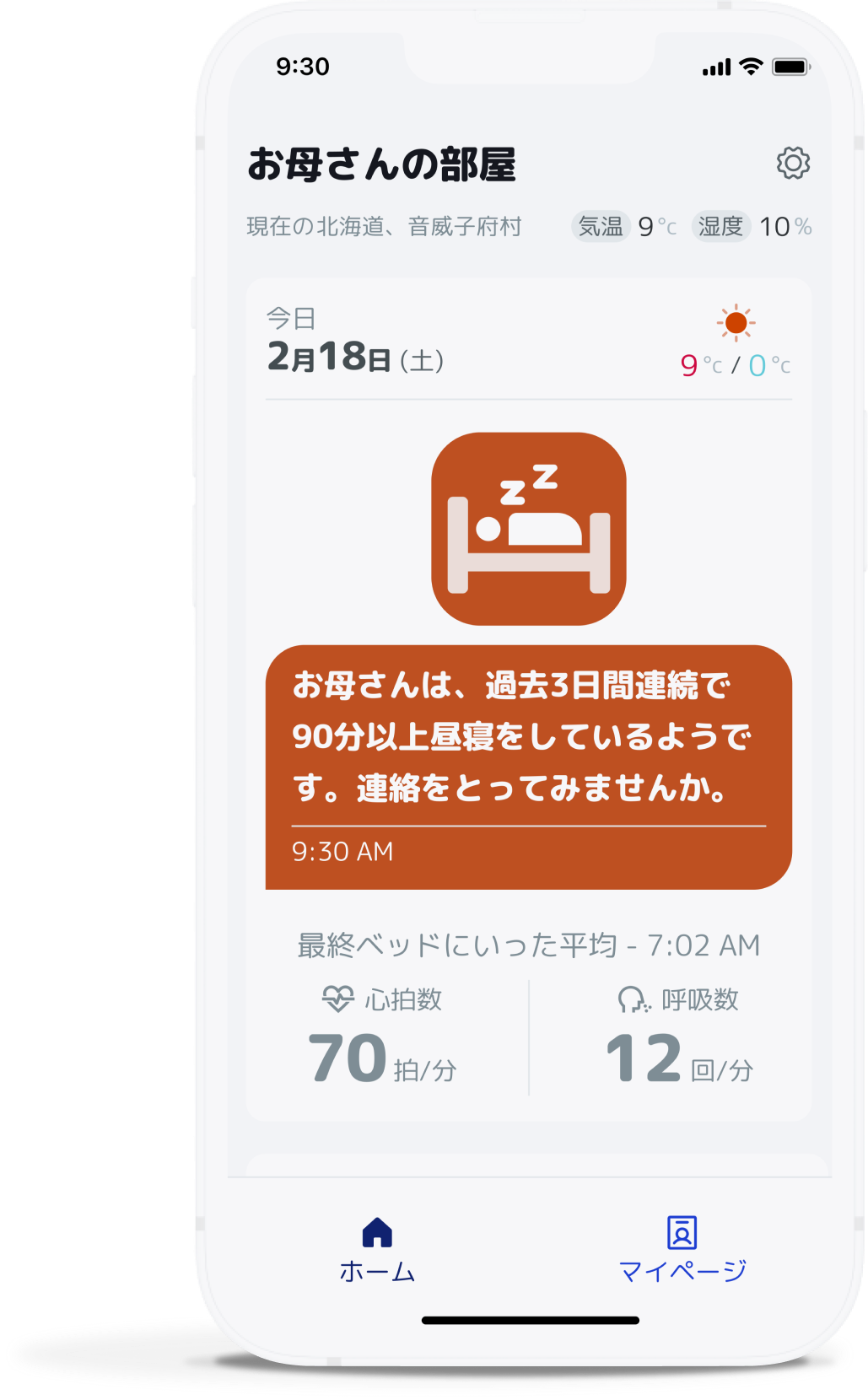 最先端のレーダー技術を搭載したデバイス「POM」があれば、カメラでご家族を監視することも、スマートウォッチなどのウェアラブルデバイスを身に着けてもらうことも不要です。大切なご家族の健康や睡眠習慣をスマートに知ることで、ユーザーとご家族の両方に安心(Peace of Mind)を提供します。