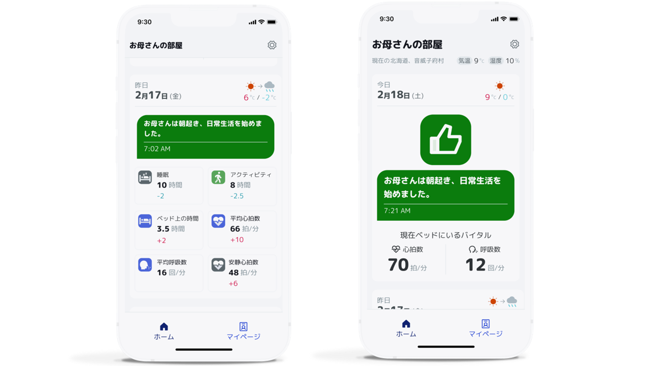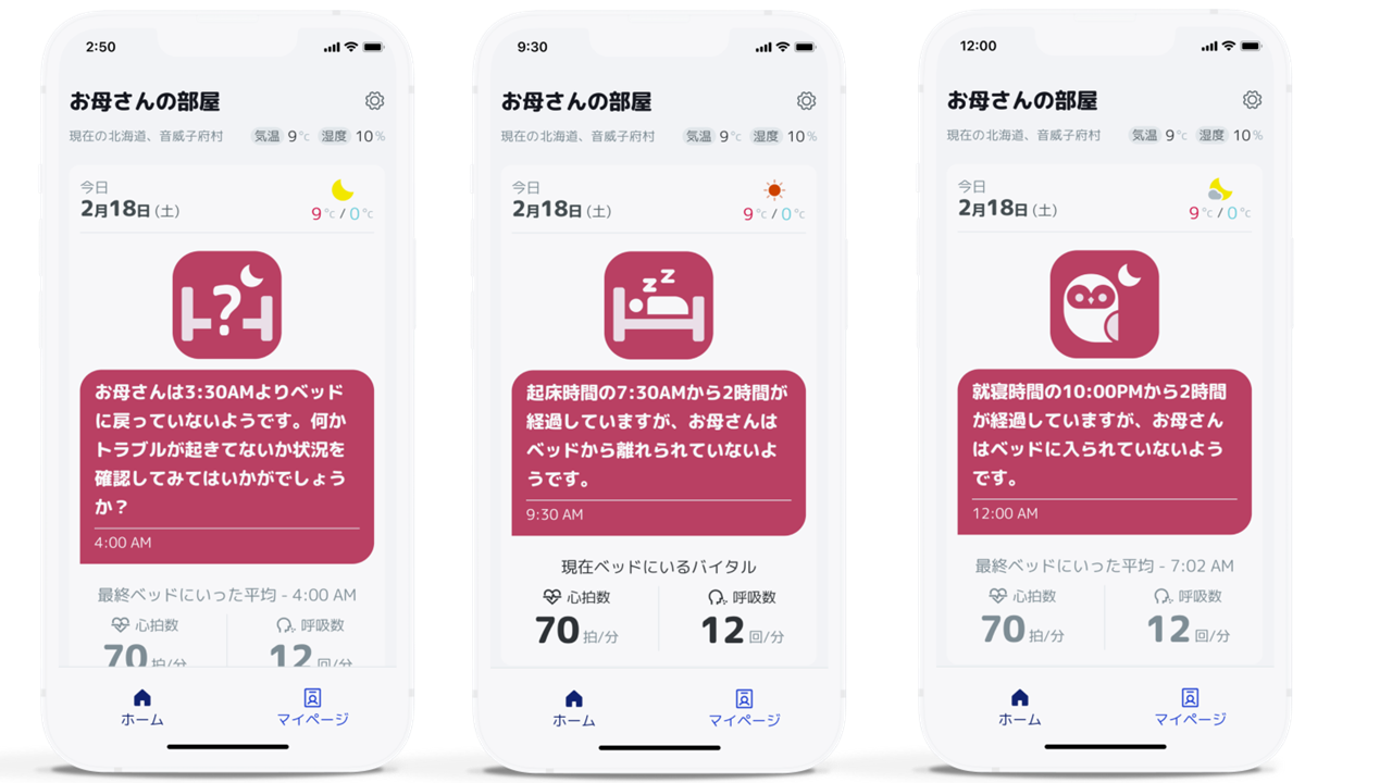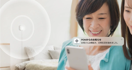 POMは、子や孫世代のユーザーが、離れた場所で一人暮らしをする高齢のご家族を見守る目的で設計、開発されています。寝室に設置された「POM」の端末は、専用アプリを通してご家族が“今までの生活”と変わりなく過ごしているかをお知らせします。