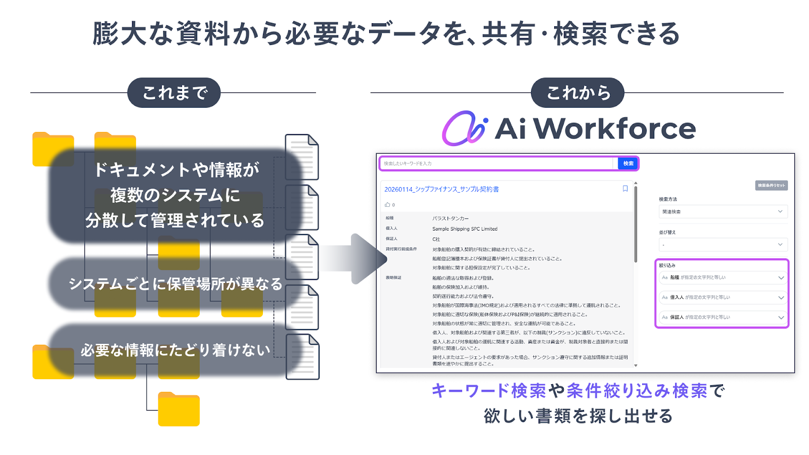 こうした課題に対し、業務ごとに異なる契約書様式や必要情報を柔軟に設計・運用できる点が評価され、複雑な業務要件に対応しながら生産性向上を実現する基盤として「Ai Workforce」の導入が決定しました。