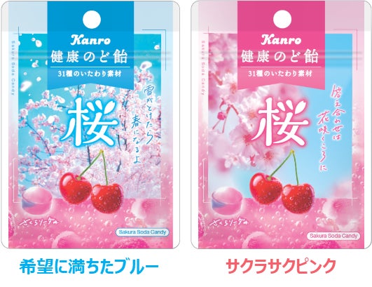 今年の「健康のど飴桜」は「忘れたくないこの瞬間、無駄にならないこの一瞬が色褪せませんように。」と願いを込めて、桜の美しさを記録するようなカメラフォーカスをイメージした、爽やかで季節感のあるパッケージデザインとなっています。カラー展開は2色で、“雪が解けたら春になるよ”というキャッチコピーを添えた「希望に満ちたブルー」と、“答え合わせは花咲くころに”というメッセージを付けた「サクラサクピンク」からお選びいただけます。