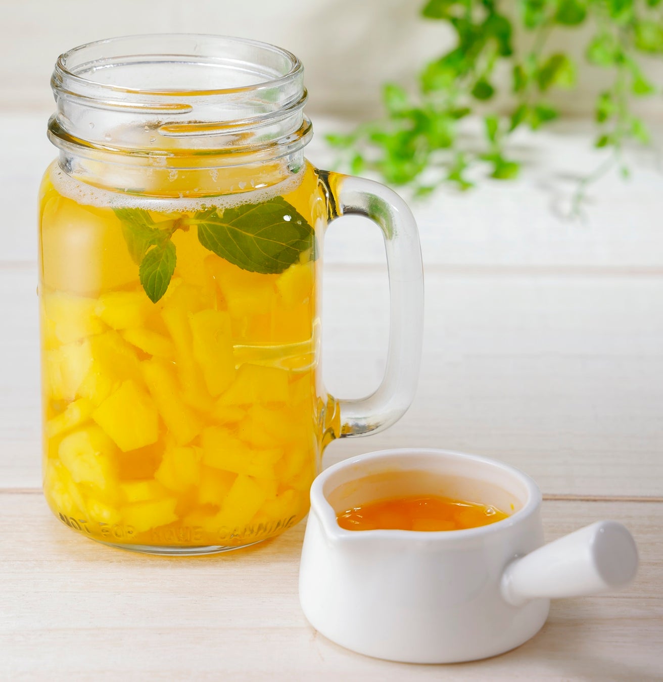 ジャスミンティーの爽やかな香りと、パイナップルの酸味、果肉入りのマンゴーソースの甘みが三位一体となって、お食事中でも楽しめます。まずはそのままで、次にパイナップルを潰しながら、最後にマンゴーソースを入れて、3回味の変化が楽しめるドリンクです。