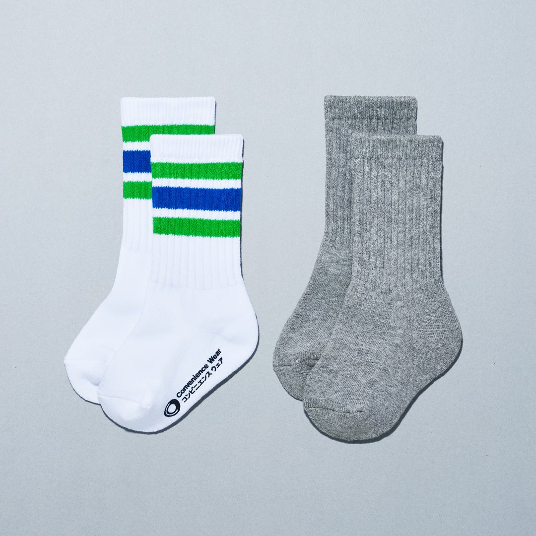 このたび、ご要望の多かった「こどもくつした」を発売いたします。13cmから19cmまで対応の小さなサイズのソックスで、定番人気の「コンビニホワイト」と、他1色を組み合わせた便利な2足組で展開いたします。破れにくい丈夫な素材で運動やお出かけにも安心。親子でのお揃いコーディネートもお楽しみいただけます。