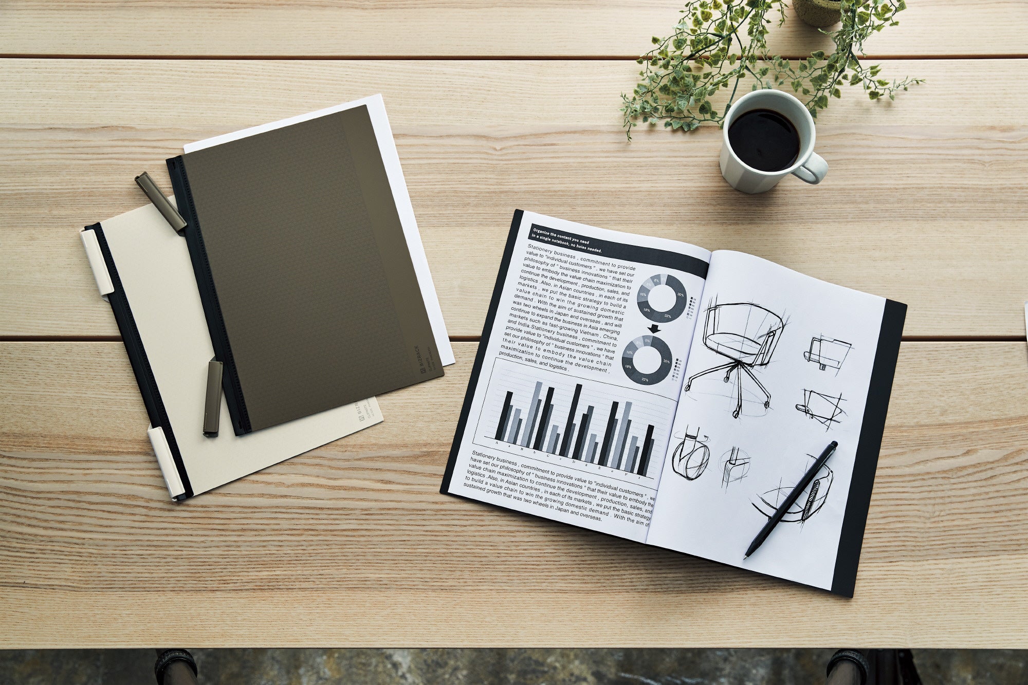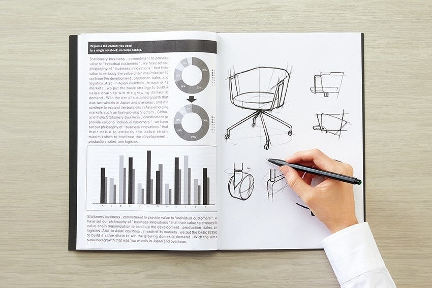 コピー用紙や資料をまとめて、ページをめくって見返したり、綴じたまま書き込んだりと、ノート感覚で使用することができます。
