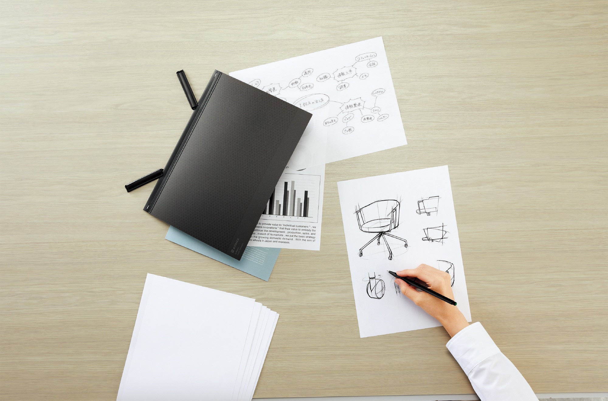 上下2つのクリップを開閉することで、A4サイズのコピー用紙や書類に穴を開けることなく、簡単に綴じられます。アイデアメモやスケッチに使用したコピー用紙を印刷書類と一緒にまとめたり、順番を自由に差し替えたりすることも可能です。