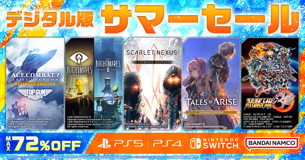 株式会社バンダイナムコエンターテインメントは、株式会社ソニー・インタラクティブエンタテインメント主催のセール『Summer Sale』へ参加し、PlayStation®4/PlayStation®5/ PlayStation🄬VRのダウンロード版ゲームがお得に買えるセールを実施中です。また、Nintendo Switch™対応のタイトルが割引価格となる『サマーセールPart.1』も開催中です。