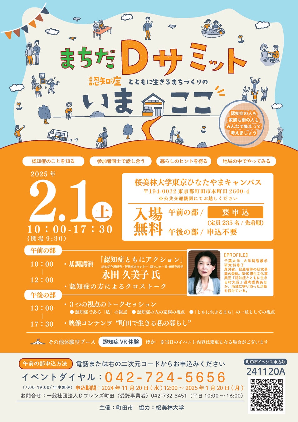 イベントでは、認知症介護研究・研修東京センター副センター長(兼)研究部長の永田久美子氏をお招きし、「認知症とともに生きるまち」について講演いただきます。また、市内に暮らす認知症の方やその家族が登壇し生の声を発信したり、参加・体験いただけるコンテンツを用意するなど、イベントを通して、「認知症とともに生きるまち」を身近に感じていただけます。