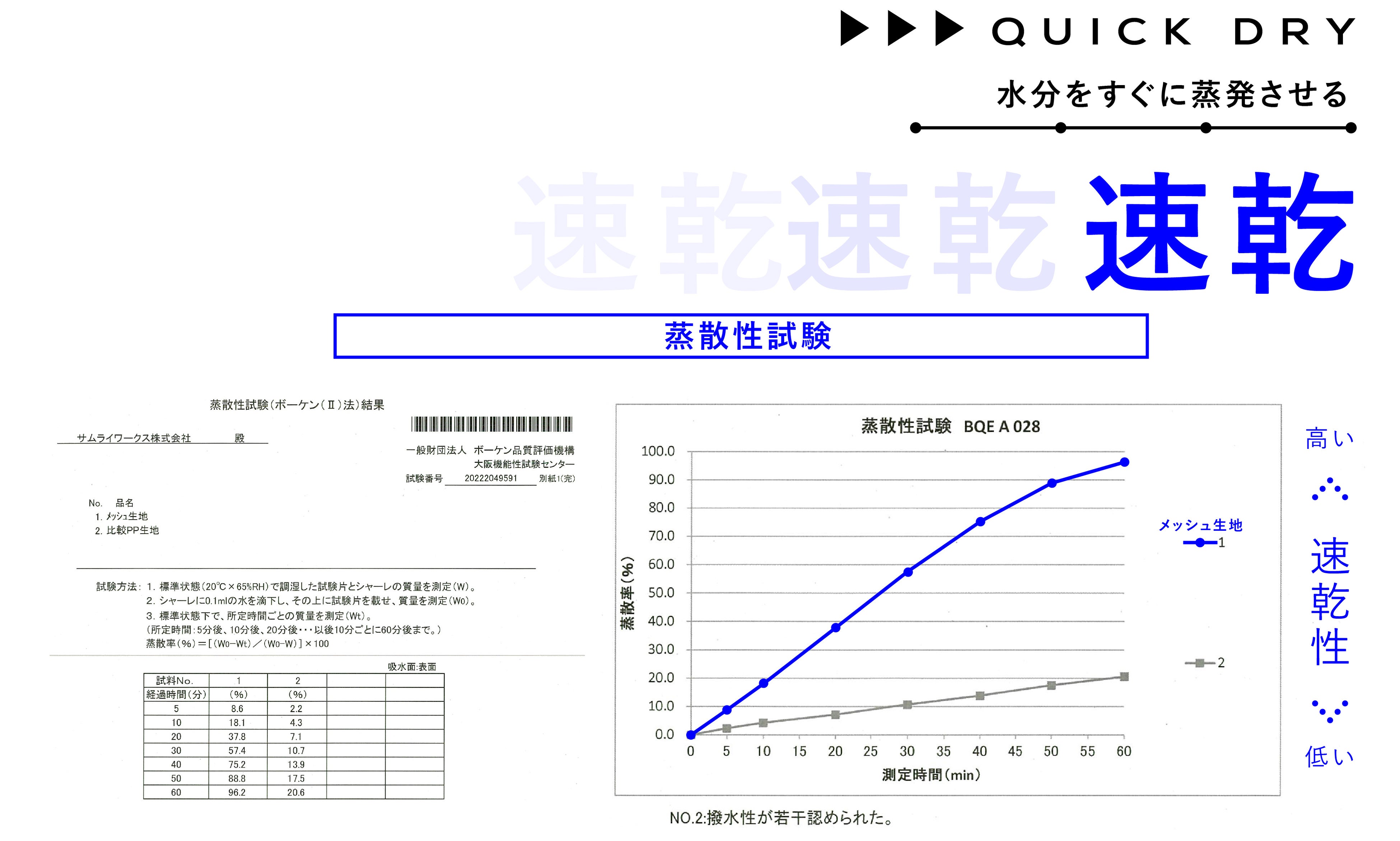 IKISURUの内側のメッシュ素材は非常に水分・蒸気の吸水性が高く、繊維の構造上吸水した水分・蒸気をすぐに空気中に拡散。速乾性も兼ね備え、マスク内のジメっとしたムレを防ぎ快適な状態をキープ。