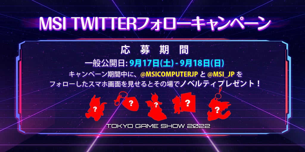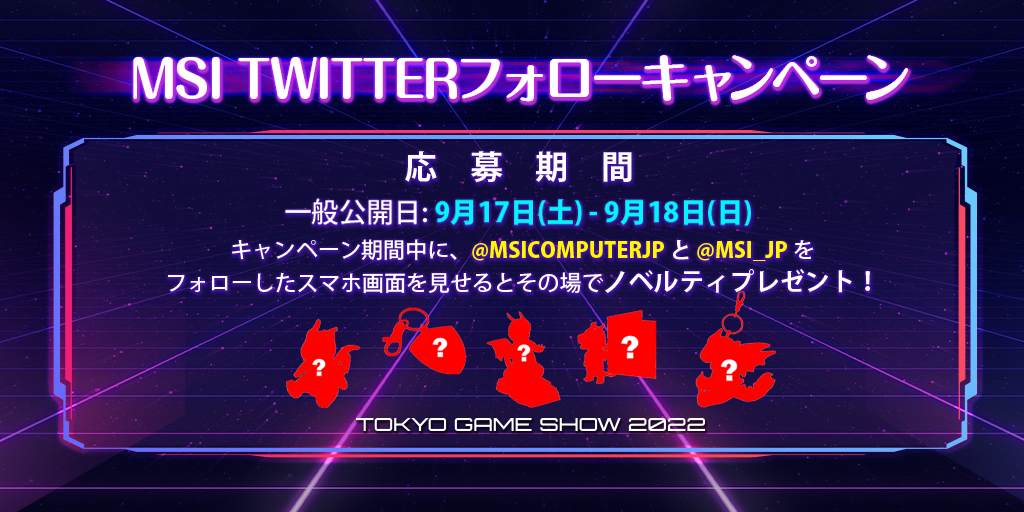 キャンペーン期間中に、@MSICOMPUTERJPおよび@MSI_JP をフォローしたスマホ画面を見せると、その場でノベルティプレゼントします。