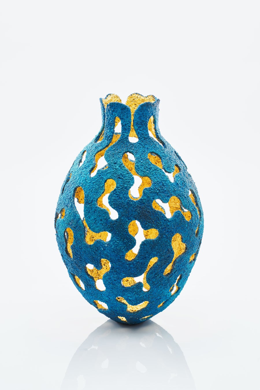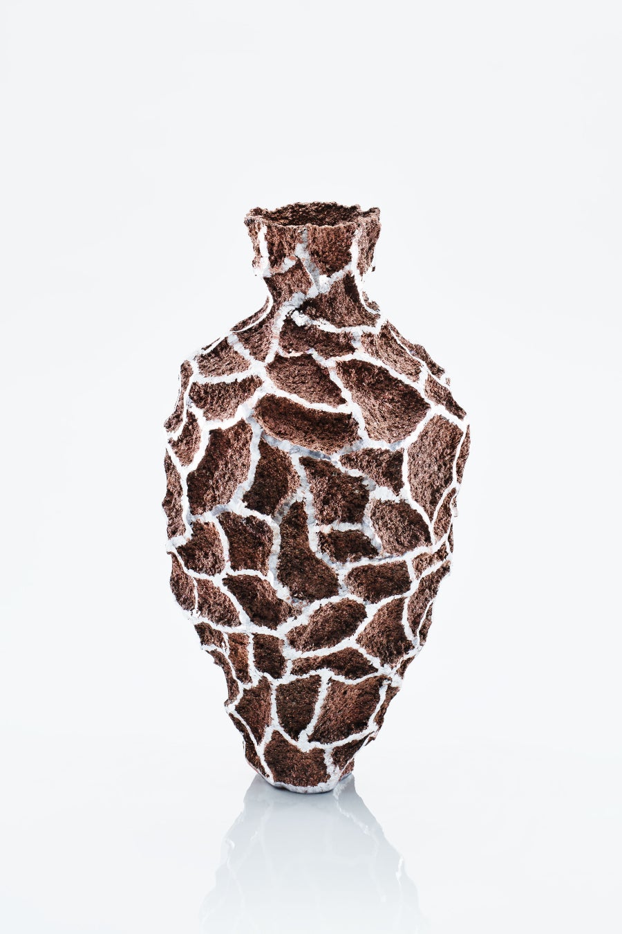 外山は、地球の核である金属という素材に魅了され制作を続けています。彼は溶解させた金属を吹き付けるというオリジナルの技法を用いて、独特なテクスチャを生み出しました。作品全体のシェイプは表面のテクスチャが際立つよう計算されつつも、どこか自然現象や生き物を想起させる線や動きがあります。金属を溶融し自らの手で再構成するプロセスを通して、地球上で行われているありとあらゆる循環を表現しています。
