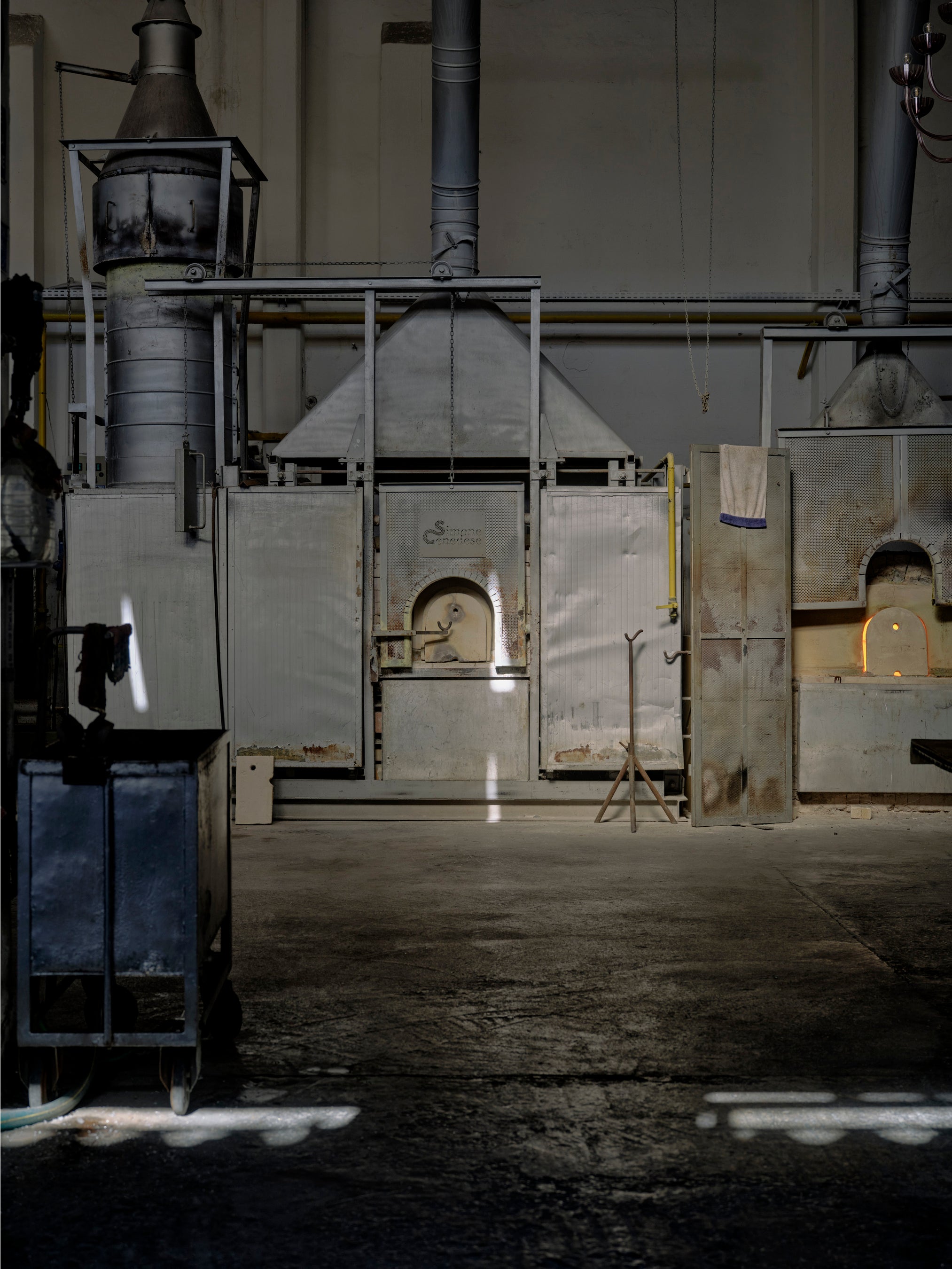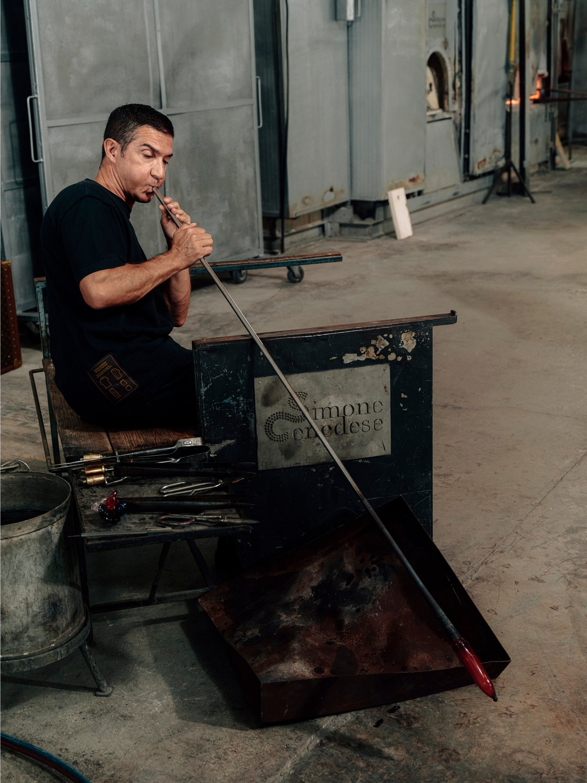 「フランクのこの上なく優美な『花びら』のデザインに命を吹き込むことは、人の手でなければ到底達成できないことです。なぜなら、職人の技に勝るものはないからです。吹きガラスの技法はとても難しいものですが、試行錯誤の末、フランクの大胆なデザインほどに、自然な優美さと流動性を表現するには、この方法しかないと確信しました」とシモーネ・セネデーセは語ります。