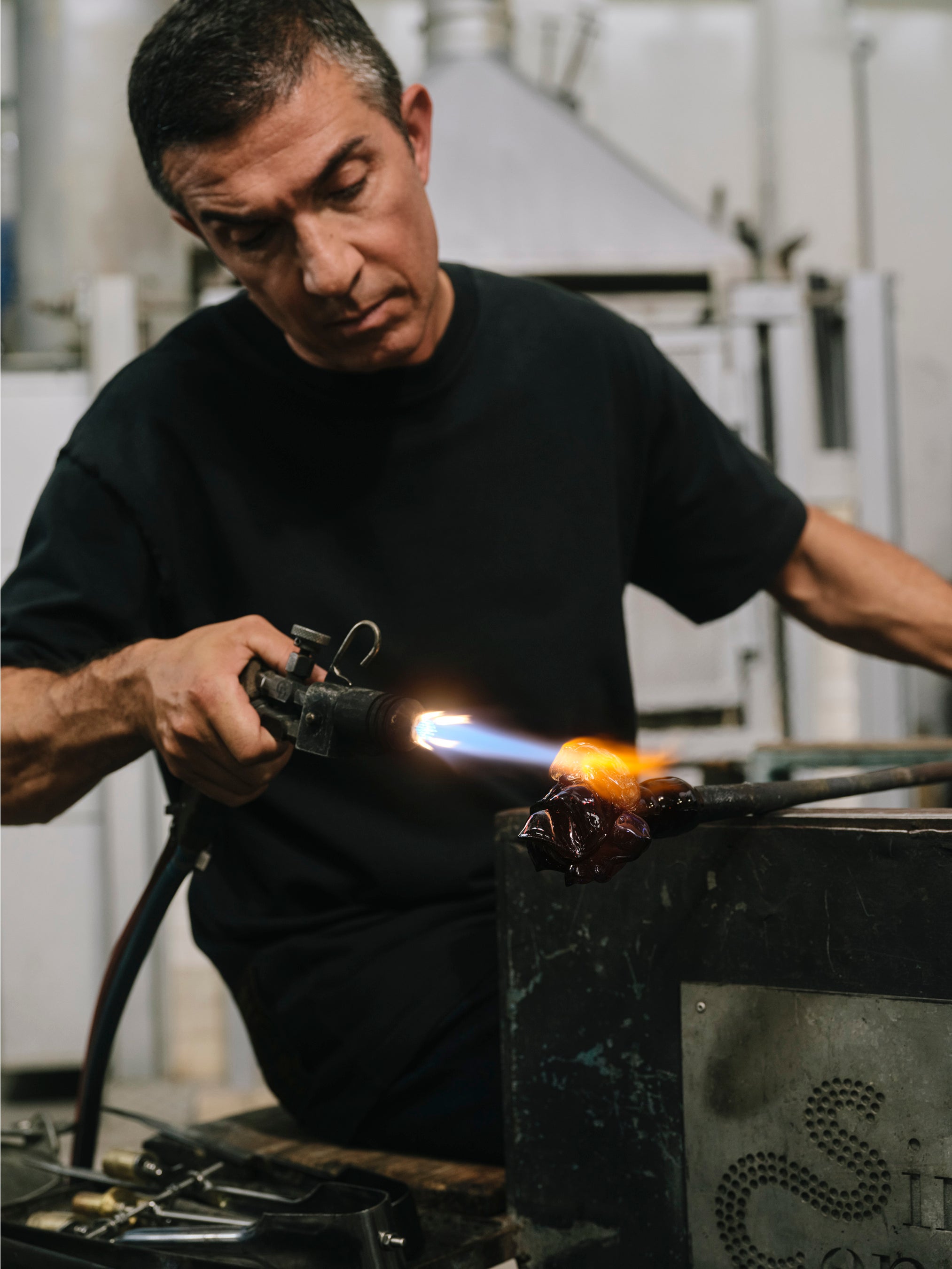 このキャップは、伝統的なヴェネツィアン・グラス製造の中心地であるムラーノで、シモーネ・セネデーセと3人の熟練したアシスタントが、まるでバレエダンスのように炉と作業台の間を絶えず移動しながら、長年培ってきた職人技のすべてを駆使して命を吹き込んだもの。それぞれのキャップは、3代目のガラス造りの巨匠が、ブラック、レッド、ブルー、そしてクリアなガラスを吹き、彫刻しました。 その結果、極上の創造性と職人技が溢れる画期的な芸術作品に仕上がりました。
