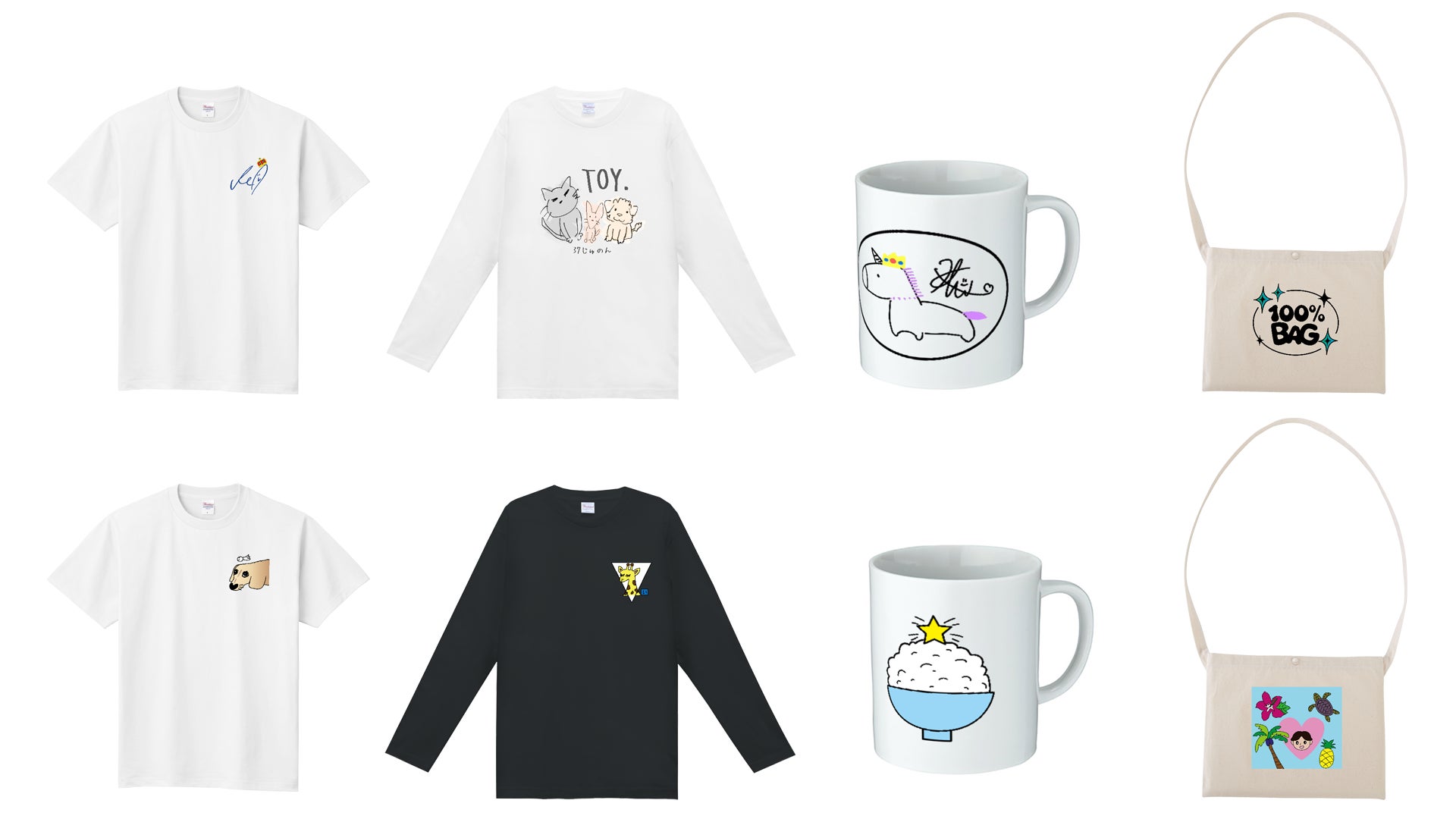 取り扱いアイテム:Tシャツ、スマホケース、文房具、のぼり旗他(毎月2アイテムずつ追加!)