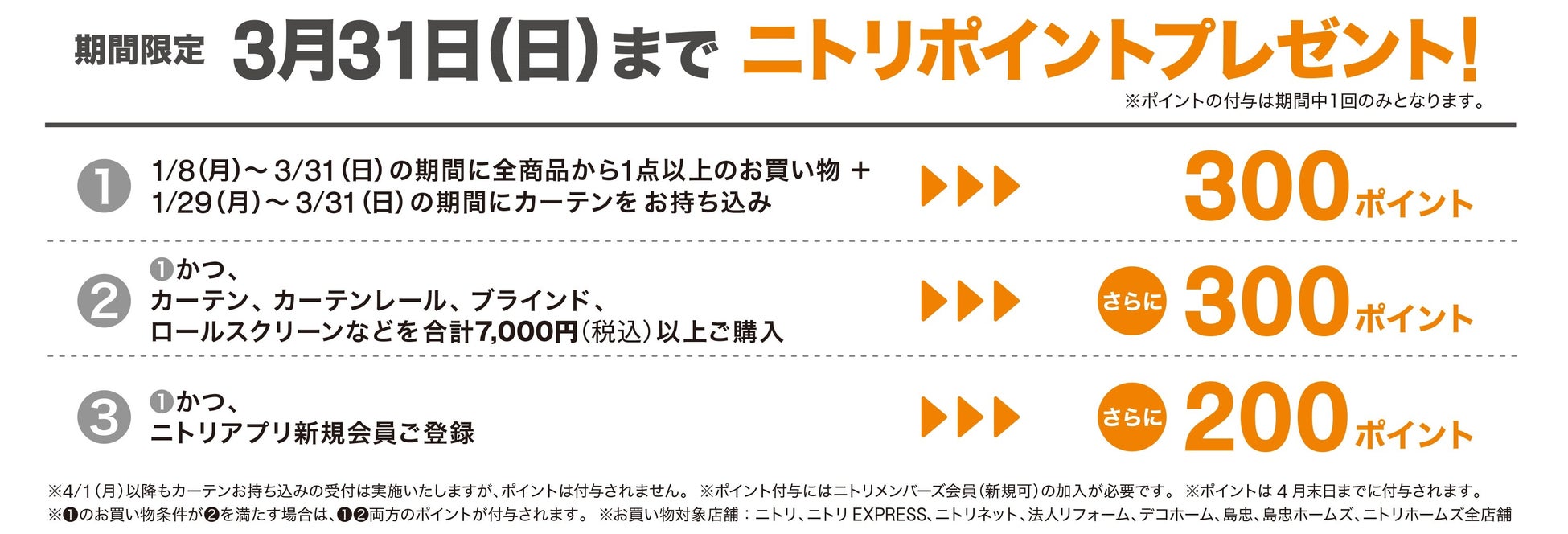 1月8日~3月31日の期間に、対象店舗でお買い物をされ、1月29日~3月31日の期間にカーテンをお持ち込みいただいた方に、ニトリポイント300ポイントをプレゼント。また、上記に加え、以下条件に該当されるお客様には、更にニトリポイントをプレゼントいたします。