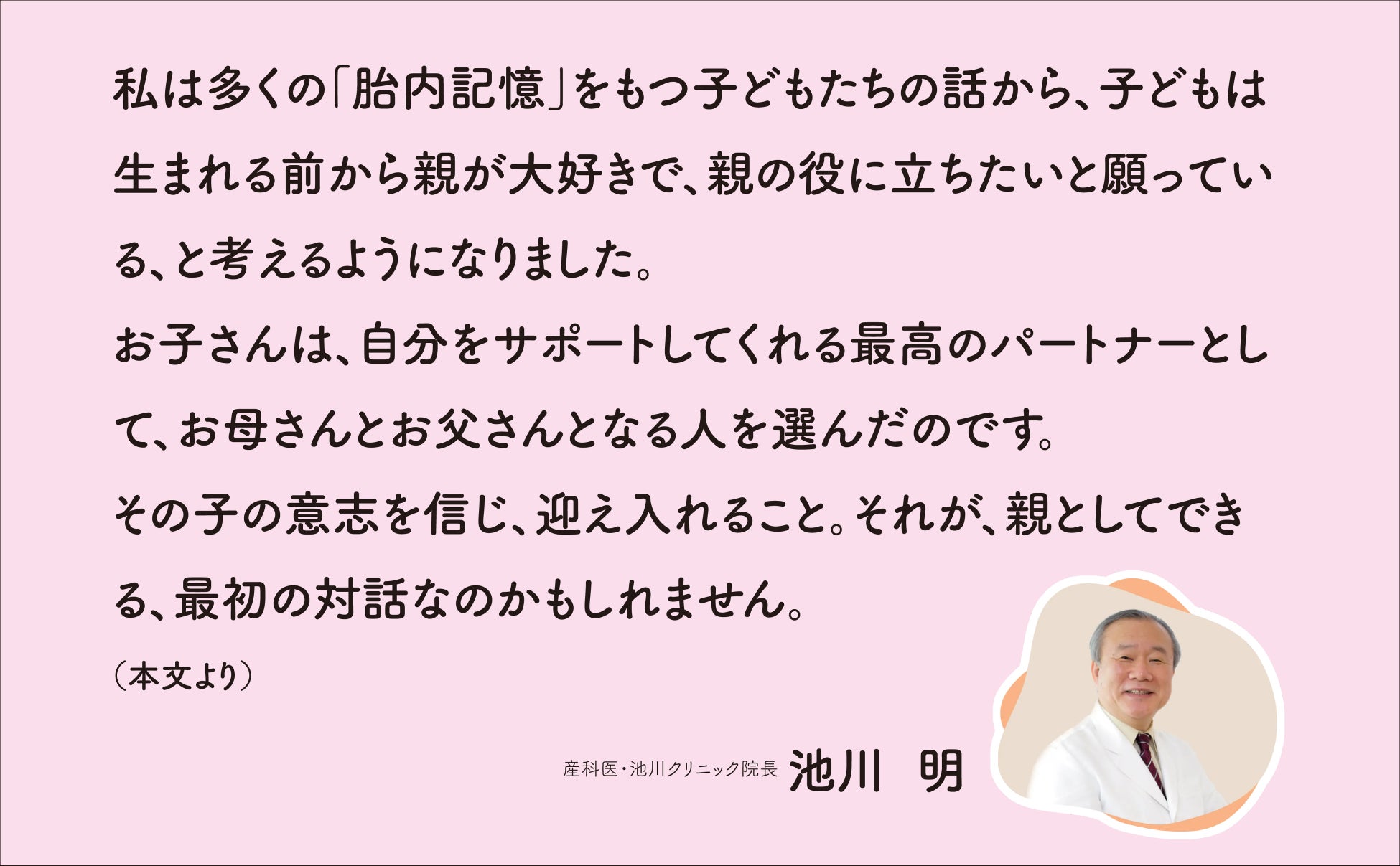 上尾中央総合病院産婦人科部長を経て、89年、横浜市に池川クリニックを開設。「胎内記憶」の研究発表がマスコミで紹介され、話題に。現在は、外来診察の傍ら、胎内記憶を世界に広めるための講演活動とセミナーを行っている。一般社団日本胎内記憶教育協会代表理事。アメリカ出生前・周産期心理学協会(APPPAH)会員。ドキュメンタリー映画『かみさまとのやくそく~あなたは親を選んで生まれてきた~』に出演。胎内記憶での活躍が評価され、Spirit of APPPAH Outstanding Advocacy、 Hall of Honor of Prenatal Sciences 受賞。『この世に生まれてきた大切な理由』(小社刊)、『ママのおなかをえらんできたよ。』(リヨン社)など、著書多数。