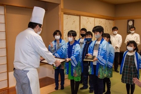 子ども海藻大使による厳正な審査の結果、「子ども海藻大使賞」は、函館国際ホテル 樋熊崚平さん作「鰤と海藻を使った2種盛り合わせ」に決定。子どもたちから樋熊さんに、賞状と盾が贈られました。今回のコンクールを通じて、料理人の方々にホソメコンブやブリの魅力が伝わり、未利用海産物の利用促進へとつながることを願っています。