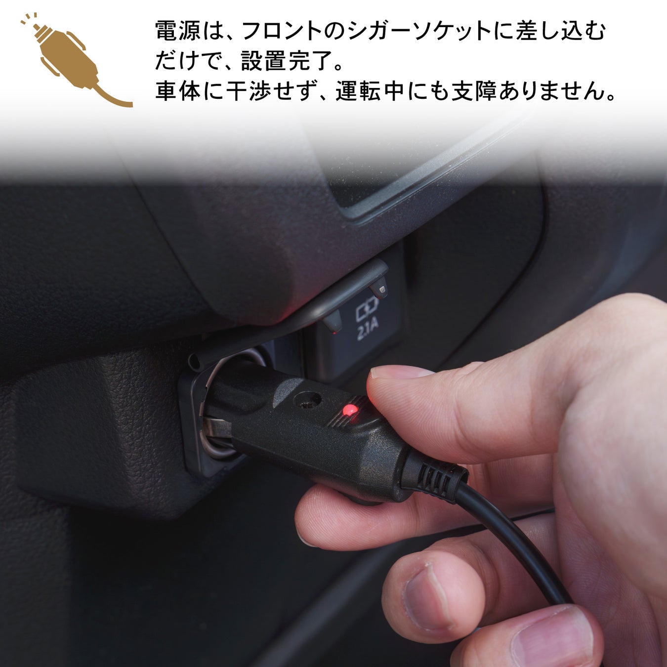 電源は、フロントのシガーソケットに差し込むだけで、設置完了。