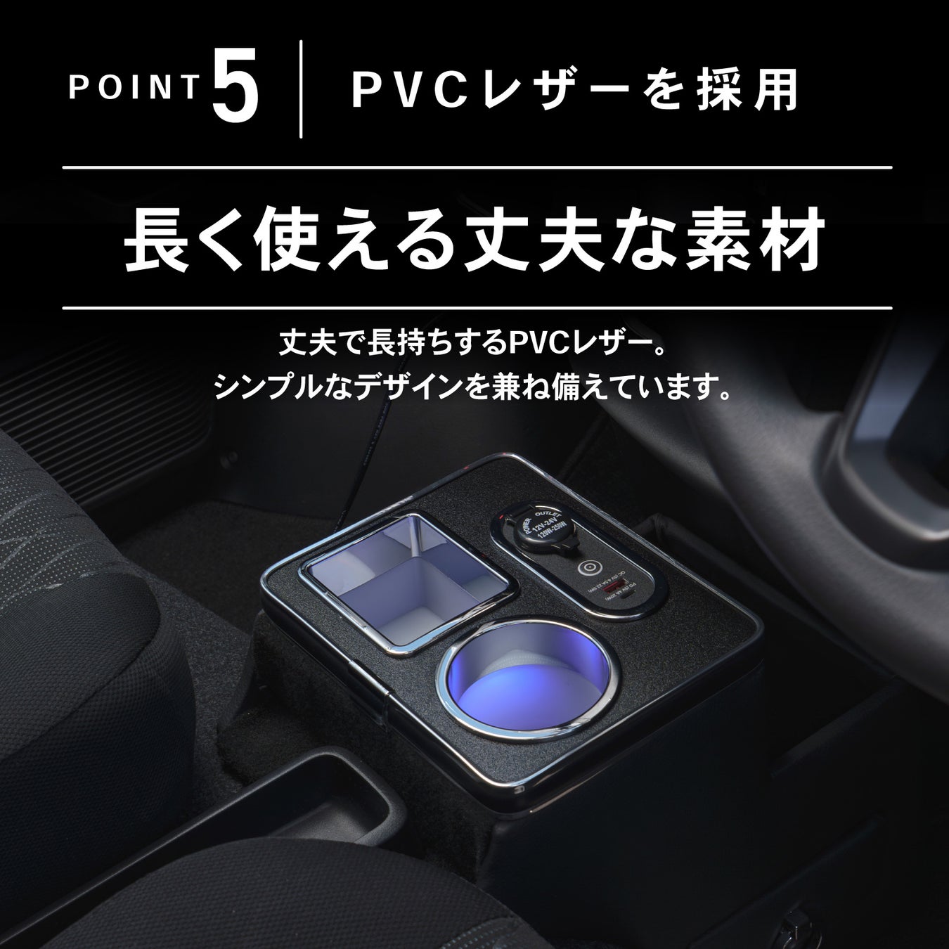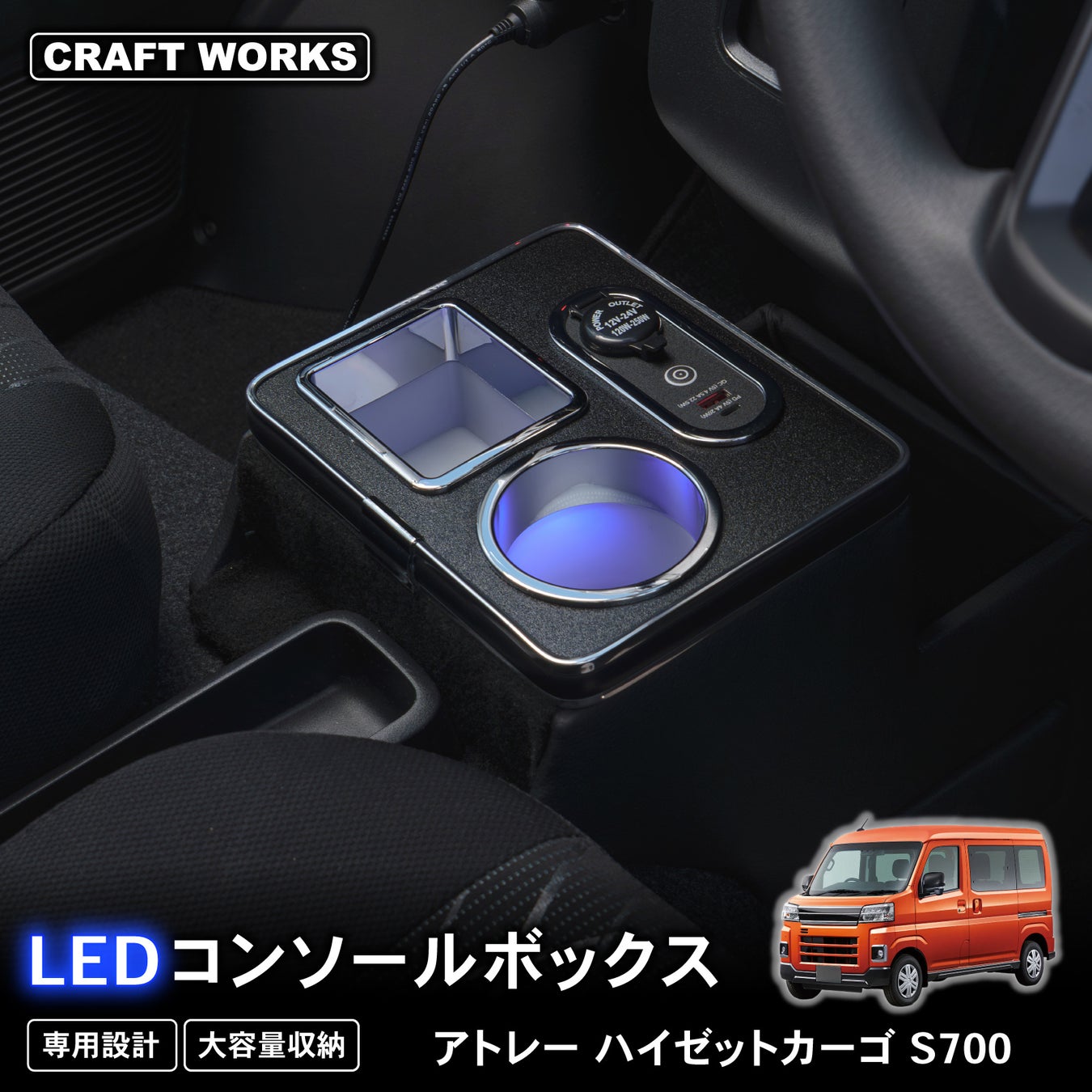 【新発売】アトレー ハイゼットカーゴ 700系 専用 LEDコンソールボックス。まるで純正のようなフィット感。収納も充電も完備。丈夫で長持ちするPVCレザーを採用。LEDで夜も安心、快適ドライブ!