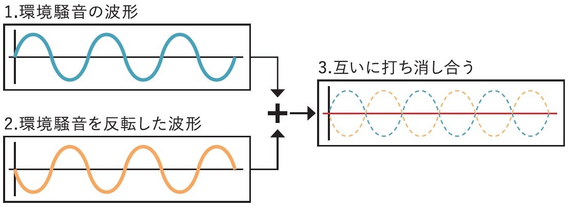 「デジタル耳せん」で採用している高精度アクティブノイズキャンセリング回路は、イヤホンに内蔵された小型のマイクロホンで周囲の環境騒音を収音し、マイクで拾った騒音とは逆位相(逆向き)の音波を発生させて、騒音を打ち消す仕組みです。