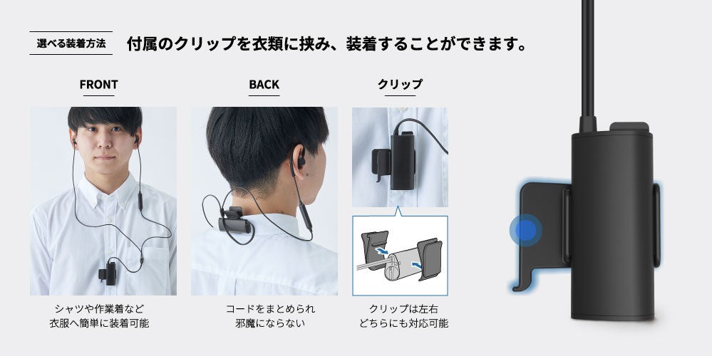 付属のクリップで衣服の前・後ろへの装着が可能です。クリップにコードをまとめられるので使用時にコードが邪魔になりません。