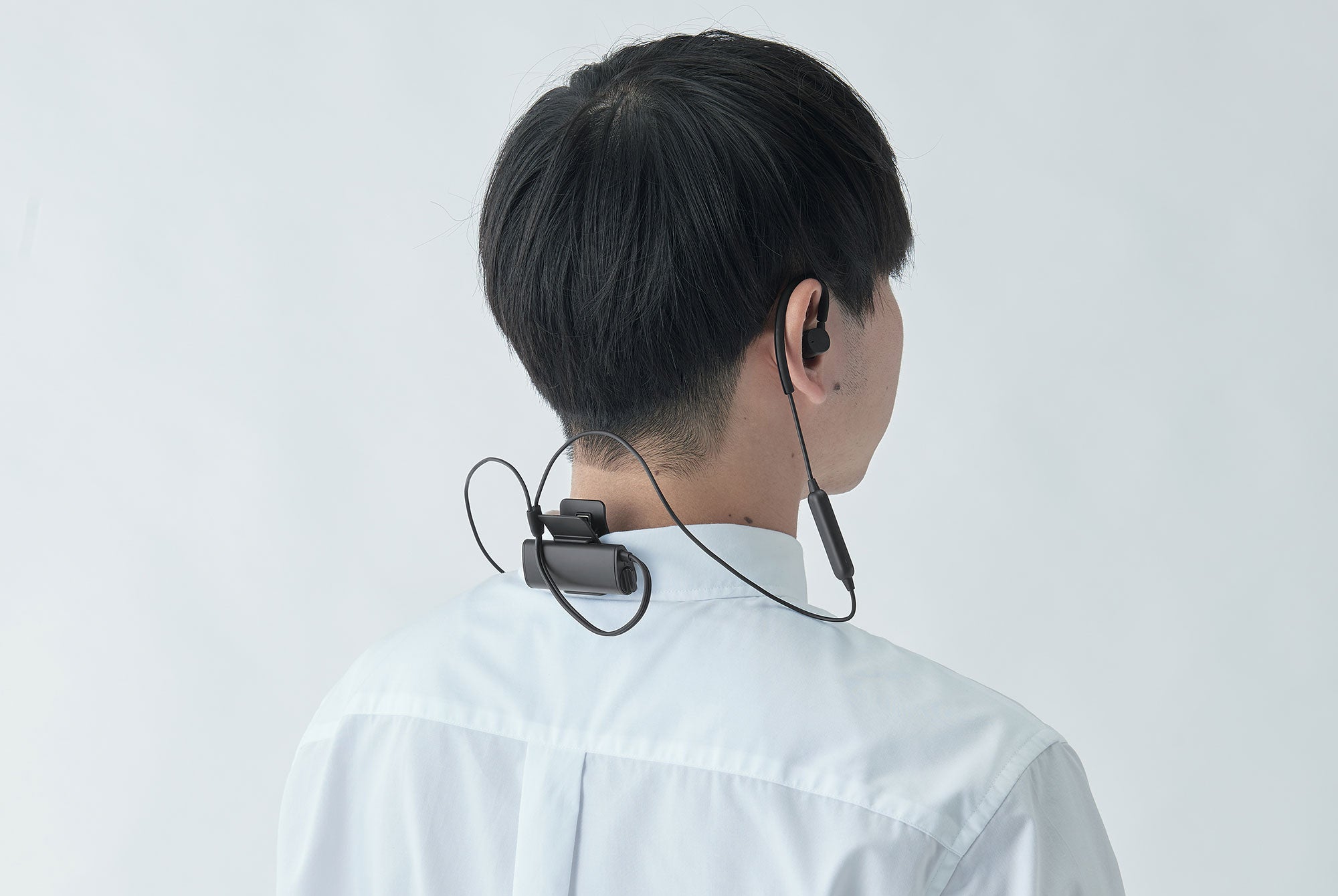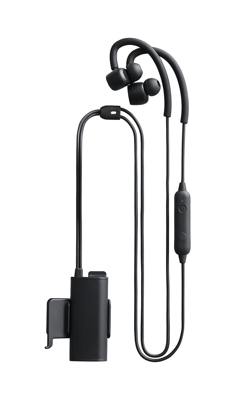 付属のクリップで衣類への装着ができ、襟に付けることでケーブルが前に垂れる事を防止できるので、工場などで作業する際もコードが邪魔になりません。また、イヤホン部にマグネットを内蔵しており、非使用時も左右のイヤホンをまとめることができます。電源は、単4形アルカリ乾電池1本で約85時間駆動※3します。