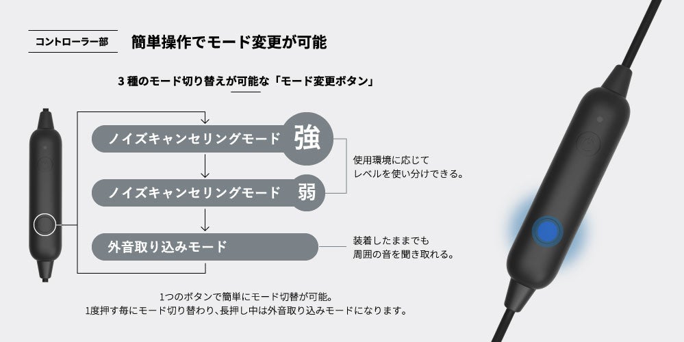 ・ノイズキャンセリングの強度を切り替えられる「モード変更ボタン」を搭載