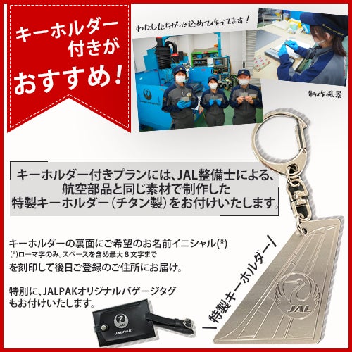 (4)JAL整備士がJAL機整備と同じ現場で製作したキーホルダー付きプランもご用意しております。キーホルダーの裏面にご希望のお名前またはイニシャル(ローマ字、スペースを含め最大8文字まで)を刻印してお届け。キーホルダー付きプランには、JALPAKオリジナルバゲージタグもお付け致します。