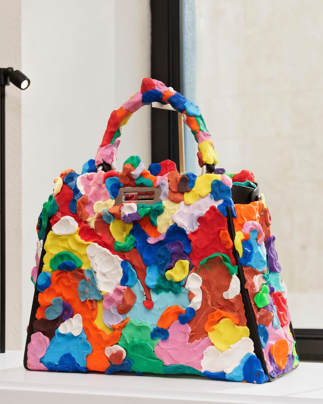 ピエルマッテイは、新しい「アーティスト ピーカブー」のインスピレーション源について、フランスのラスコー(Lascaux)の洞窟から始まったと語ります。壁に描かれた物語が、フェンディとの2度目のコラボレーションを導く着想を与えたのです。それは、象徴的な「ピーカブー」バッグの上に、手と粘土を用いて洞窟の内部空間を再構築し、成形可能な素材を通じて柔らかな回帰の形を探求するというものでした。表面や手の動き、ジェスチャーを通じて、粘土の持つ触感と自由な発想、そして「ピーカブー」バッグ本来の遊び心(子供の遊び「いないいないばあ」に由来する、隠れては驚きとともに現れるというサプライズ)が融合し、「起源」というテーマを内包した小さく持ち運びできる洞窟のようなオブジェが誕生しました。