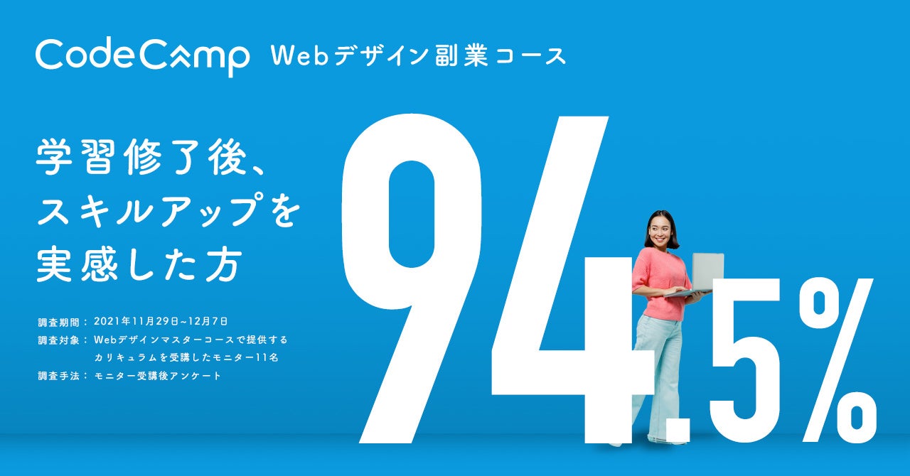 また、Webデザイナーとして働く上で必要な知識やリテラシーが学べるカリキュラムも提供することで、Webデザイナーとして独り立ちするためのスキルとリテラシーを習得することができます。過去に実施した学習モニターでは、受講生の94.5%が「スキルアップを実感した」と評価している実践型の講座です。