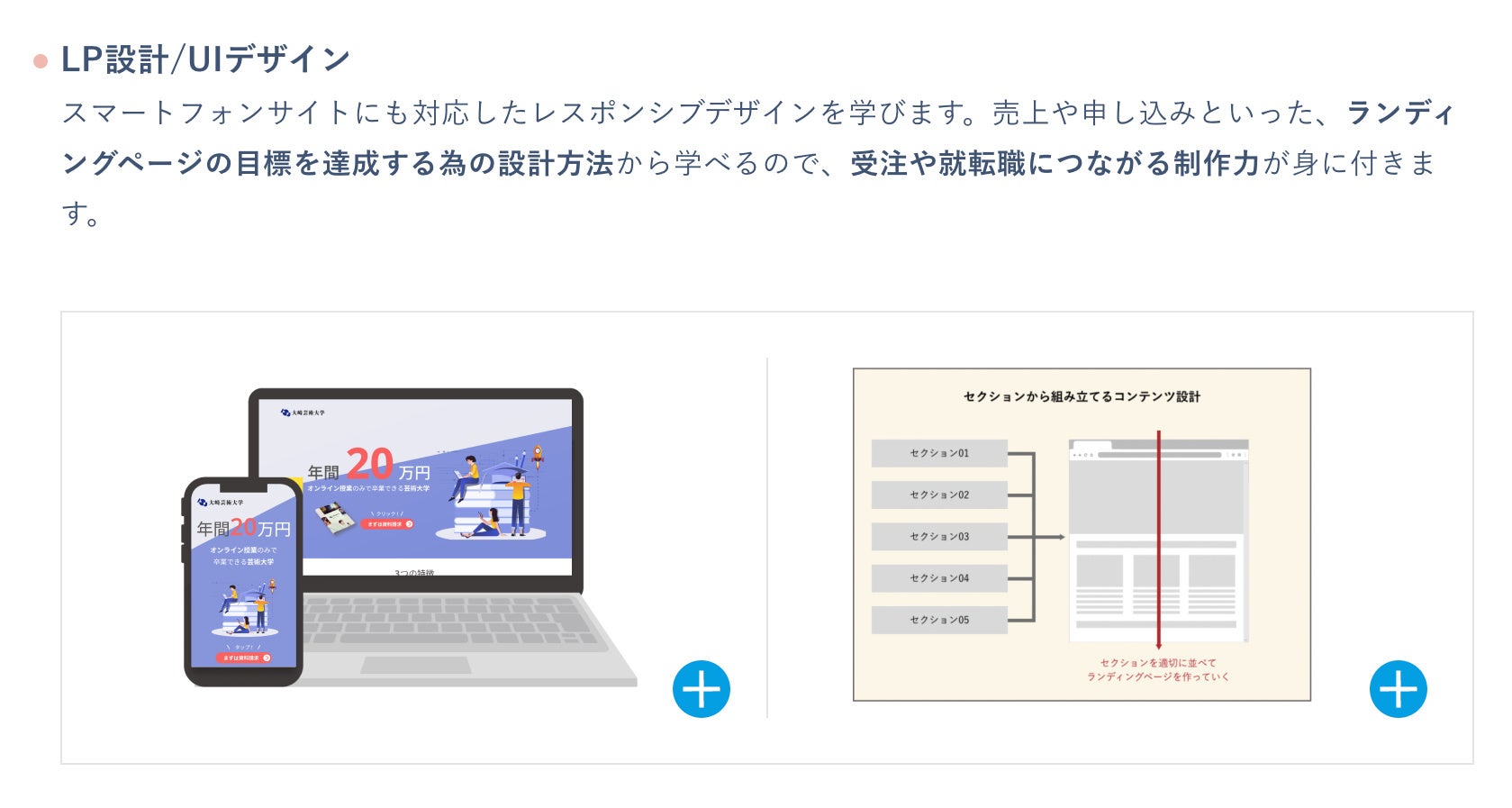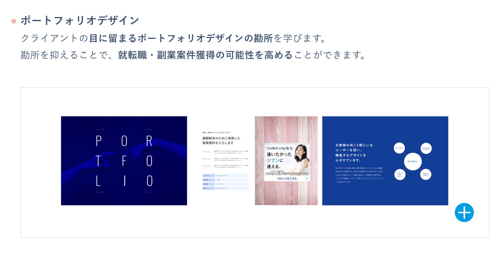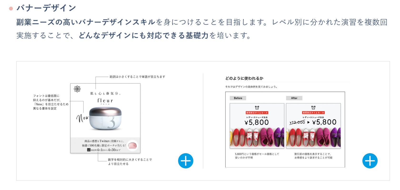 Webデザイン副業コースでは、現役のWebデザイナーと一緒にWeb制作現場での仕事の進め方を学ぶことができます。実践演習としてバナー制作、ランディングページ制作/UIデザイン、ポートフォリオデザインを行います。