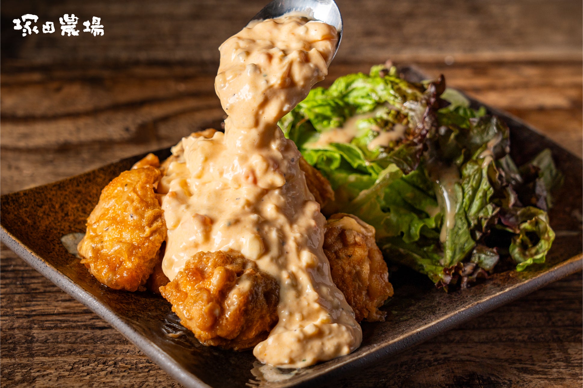 柔らかな若鶏、優しい甘酢、コクと旨味のタルタルが三位一体となった塚田農場自慢の一品。