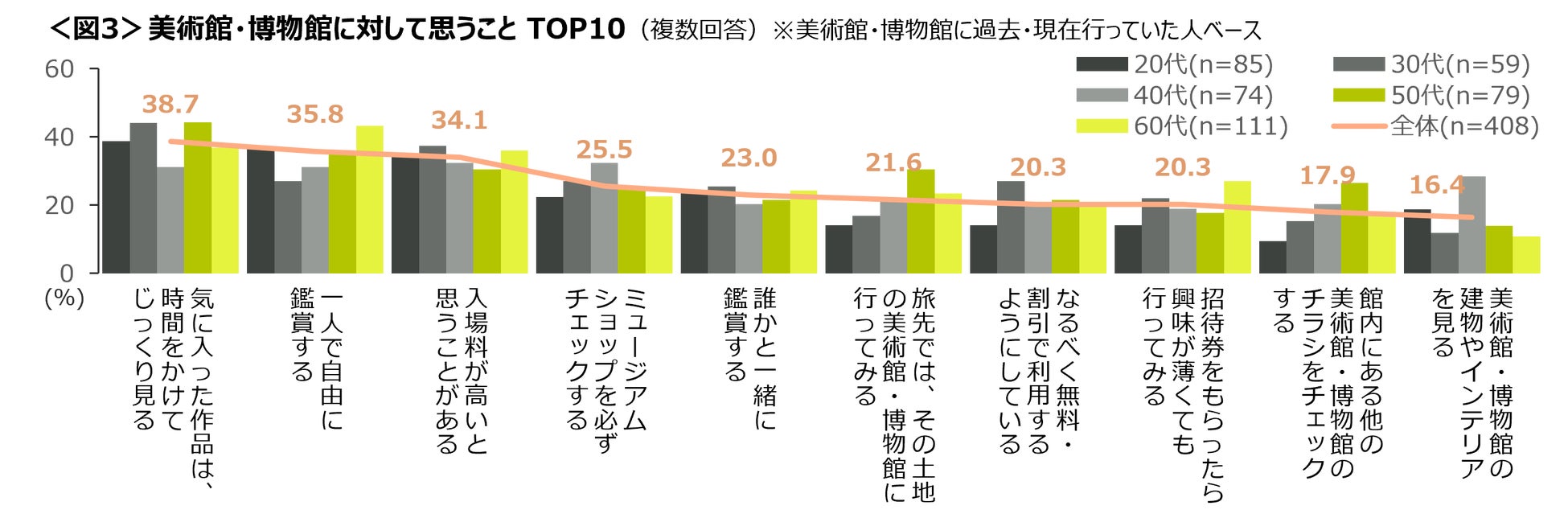 美術館・博物館に対して思うことは、「気に入った作品は時間をかけてじっくり見る」「一人で自由に鑑賞する」「入場料が高いと思うことがある」がTOP3。