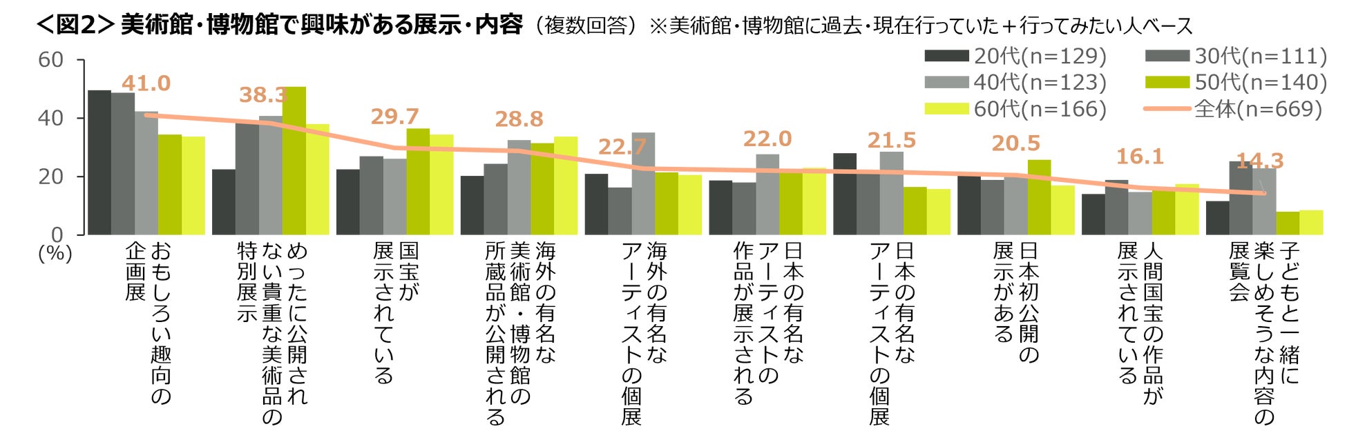 20代・30代は「おもしろい趣向の企画展」、40代は「海外の有名なアーティストの個展」「日本の有名なアーティストの作品が展示される」などアーティスト関連の項目、50代は「めったに公開されない貴重な美術品の特別展示」への関心が高く、年代によって差がみられる。<図2>