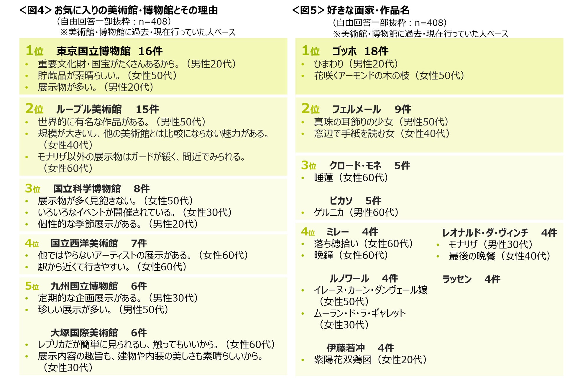 お気に入りの美術館・博物館は、「東京国立博物館」「ルーブル美術館」などで、国宝といった展示物の魅力や展示物の多さが理由。<図4>好きな画家・作品は「ゴッホ」の「ひまわり」が最も多くあがった。<図5>