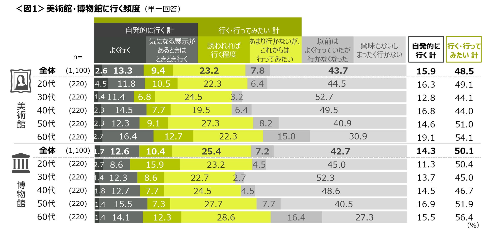 美術館・博物館に自発的に行く人は、いずれも1割半ば。「誘われれば行く程度」「あまり行かないが、これからは行ってみたい」も含めた、美術館・博物館に行く・行ってみたい人は約半数。
