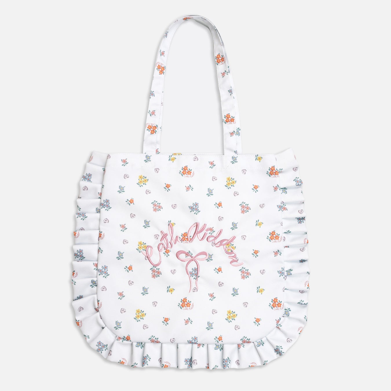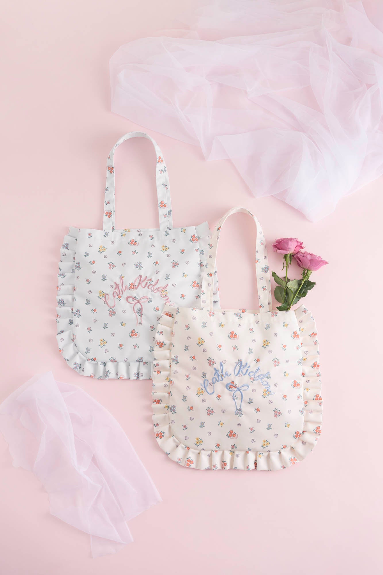 また、大人気の2つのアイテムにも新アート「Button Block Floral」が登場。フリルトートバッグは、とびきりフェミニンな魅力をたっぷり詰め込んでいます。刺繍で施したリボンロゴがポイントです。程よく厚手の生地で型崩れしにくく、綺麗な形でお使いいただけます。肩掛けにできる長めのハンドルで、内側にはポケットがついています。