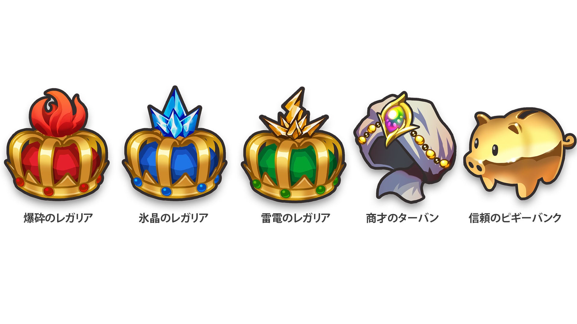 ・アクセサリ:「爆砕のレガリア」「氷晶のレガリア」「雷電のレガリア」「商才のターバン」「信頼のピギーバンク」