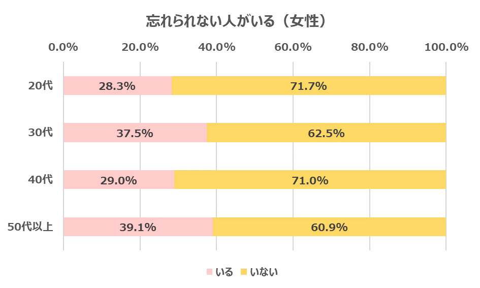 年代別、男女別に表したのが以下のグラフです。わずかではありますが、男性は20代がもっとも忘れられない人が多いという結果となりました。対する女性は30代と50代以上が35%を越えており、50代以上の方に関しては4割近くの方が忘れられない人がいるようです。